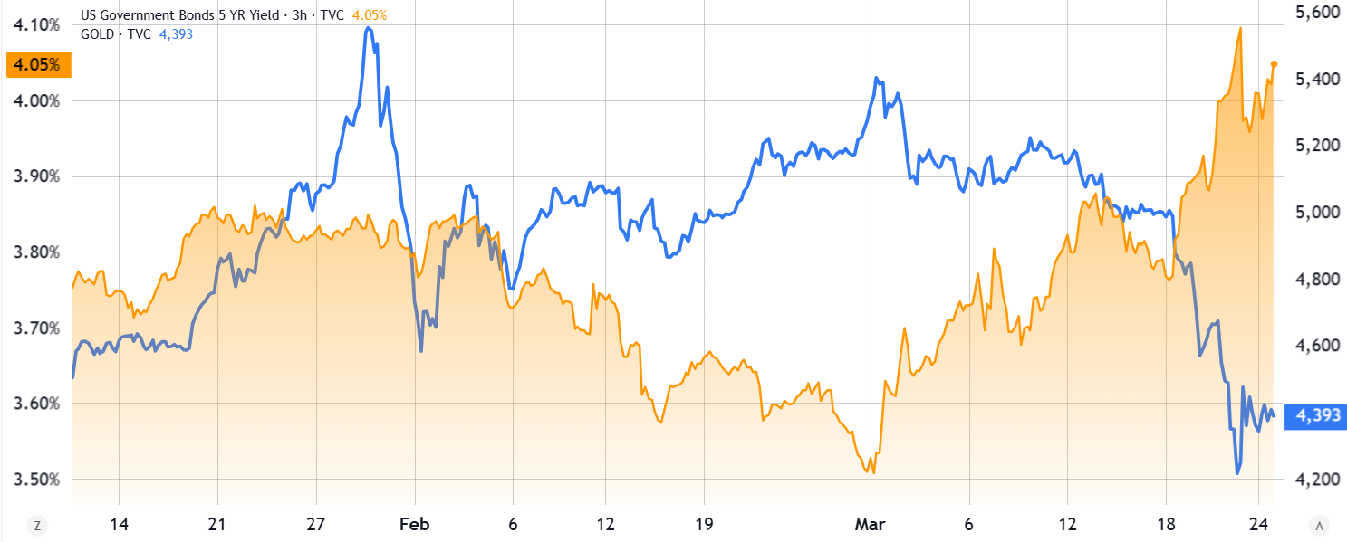 The ongoing war in Iran pushed oil prices past $90, creating inflationary pressure. The Wall Street Journal reported that the US planned to deploy roughly 3,000 troops to the Middle East to counter Iran’s influence over the Strait of Hormuz. Part of the decline in gold prices was likely linked to fading expectations for US monetary policy easing in the near term.