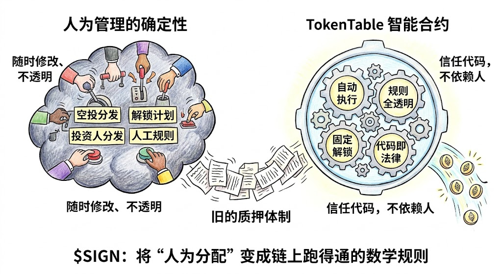 说实话,研究@SignOfficial 底下那个TokenTable挺久了。一开始我就把它当成个B端工具,帮项目方把空投、解锁、投资人分发这些东西,全写进智能合约里,自动执行。这样大家都省心,谁也别想随意改规则或者搞些不透明的操作。上个牛市,这种工具确实能解决不少实际问题,项目方也乐意用它来建立信任。但越往后看,我越有点犹豫。这玩意儿能活得好,前提是项目方还愿意靠发币、搞空投来吸引人。可现在这行业风向明显变了,大家不玩流量那一套了,都开始讲Real Yield,看真实收益。好多团队在收着打,空投力度也小了。上一轮的经验也证明,光靠空投吸引来的,基本都是撸毛党,留不住。如果以后大家都靠协议自己赚钱,而不是靠发币来刺激,那TokenTable的使用场景可能会少很多,从刚需变成特定阶段才用一下的工具。这确实是我最拿不准的一点。不过,我还是给它贴了个#Sign 地缘政治基建的标签。因为说到底,TokenTable这东西,是把“人为分配”的权力,变成链上跑得通的数学规则。信任,从依赖项目方,变成了依赖代码。要是这套东西哪天成了行业标配,就像ERC-20那样,那它就成了资产分发和解锁最底层的信任层了。真到了那一步,管道协议的网络效应一旦起来,护城河就非常深了。