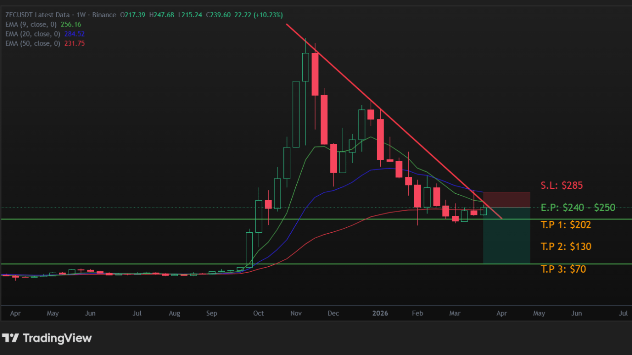 Há semanas, publiquei esta configuração curta no gráfico semanal do ZEC. A estrutura era um cunho descendente limpo formando após um pico violento próximo a $770 em outubro de 2025. Cada recuperação foi vendida. Cada rali desapareceu. As EMAs estavam se revertendo no semanal — um alinhamento baixista de manual.