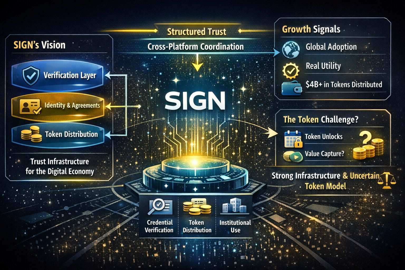 Como infraestrutura, o SIGN tem um forte caso. A direção faz sentido. A pilha de produtos parece mais próxima da utilidade real do que a maioria dos middleware de crypto. O mercado precisa cada vez mais de sistemas que possam verificar reivindicações em ambientes digitais fragmentados. Se finanças, identidade, ativos tokenizados, acordos online e atividades digitais regulamentadas continuarem convergindo, então a verificação não se torna opcional. Torna-se uma camada central.