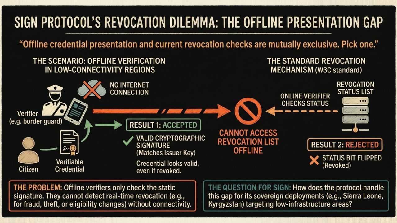 Para ser justo com @SignOfficial , a crítica de design do whitepaper reconhece o que o crítico acertou de uma maneira diferente: o Sign está construindo uma camada de confiança, não resolvendo a física da conectividade da internet. Se um verificador não tem conexão, nenhuma infraestrutura de credenciais no mundo — baseada em blockchain ou não — pode enviar o estado de revogação para eles. A questão é se o Sign construiu um mecanismo específico para implementações soberanas primeiro offline que lide com isso de maneira elegante, ou se depende de assumir conectividade que suas jurisdições-alvo muitas vezes não têm.
