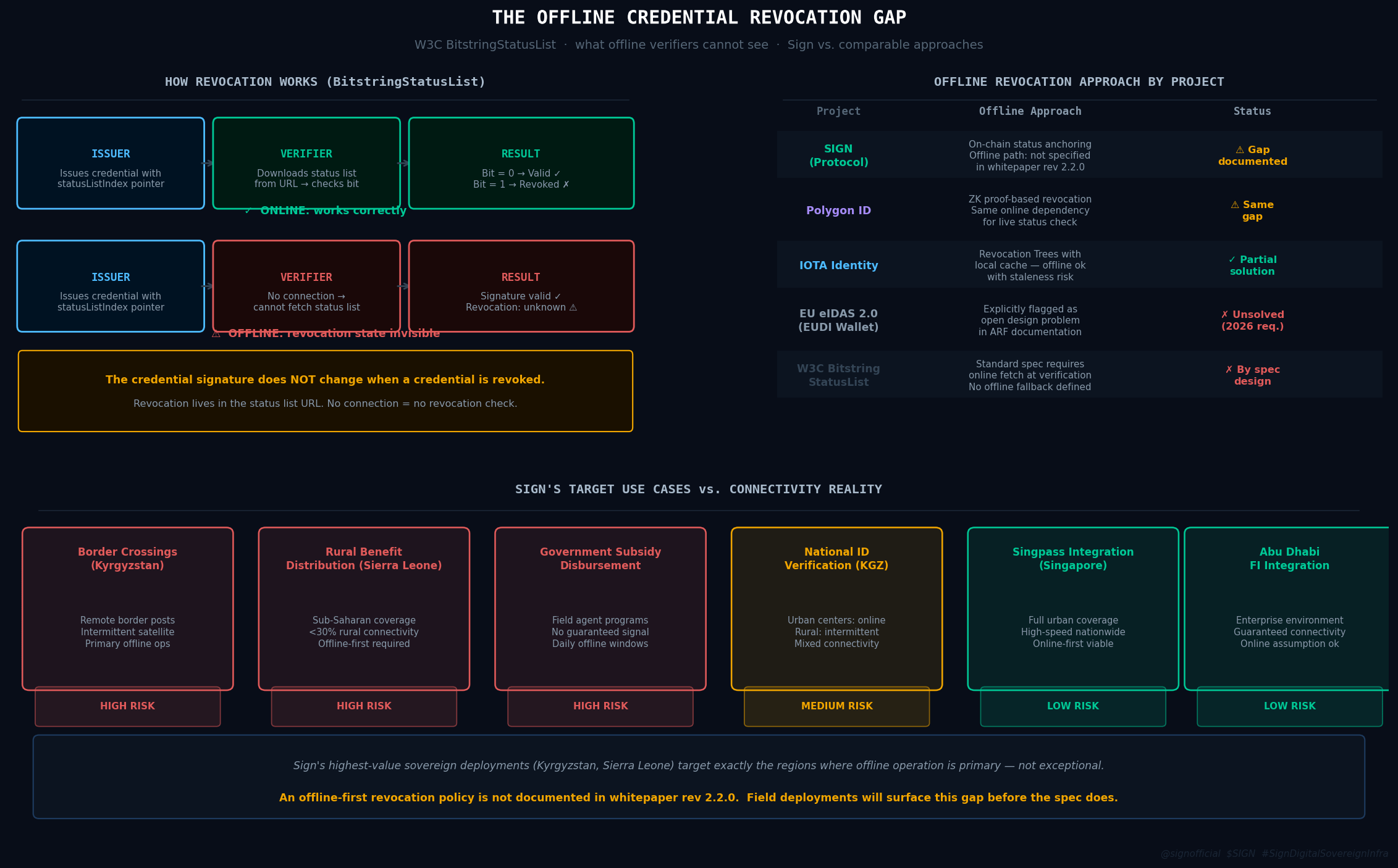 Há algumas semanas, encontrei um tópico no X de um desenvolvedor do grupo de trabalho de Credenciais Verificáveis do W3C — não um crítico específico, apenas alguém lidando com as implicações da implementação offline da especificação BitstringStatusList. O post era curto, talvez 280 caracteres, e recebeu cerca de 340 curtidas e 80 respostas antes de eu vê-lo. A observação principal era simples o suficiente: "A apresentação de credenciais offline e as verificações de revogação atuais são mutuamente exclusivas. Escolha uma." Essa linha me fez voltar para o artigo de @SignOfficial pela terceira vez, desta vez olhando especificamente como o ciclo de vida da credencial lida com as regiões de baixa conectividade que as implantações soberanas do Sign estão explicitamente mirando.