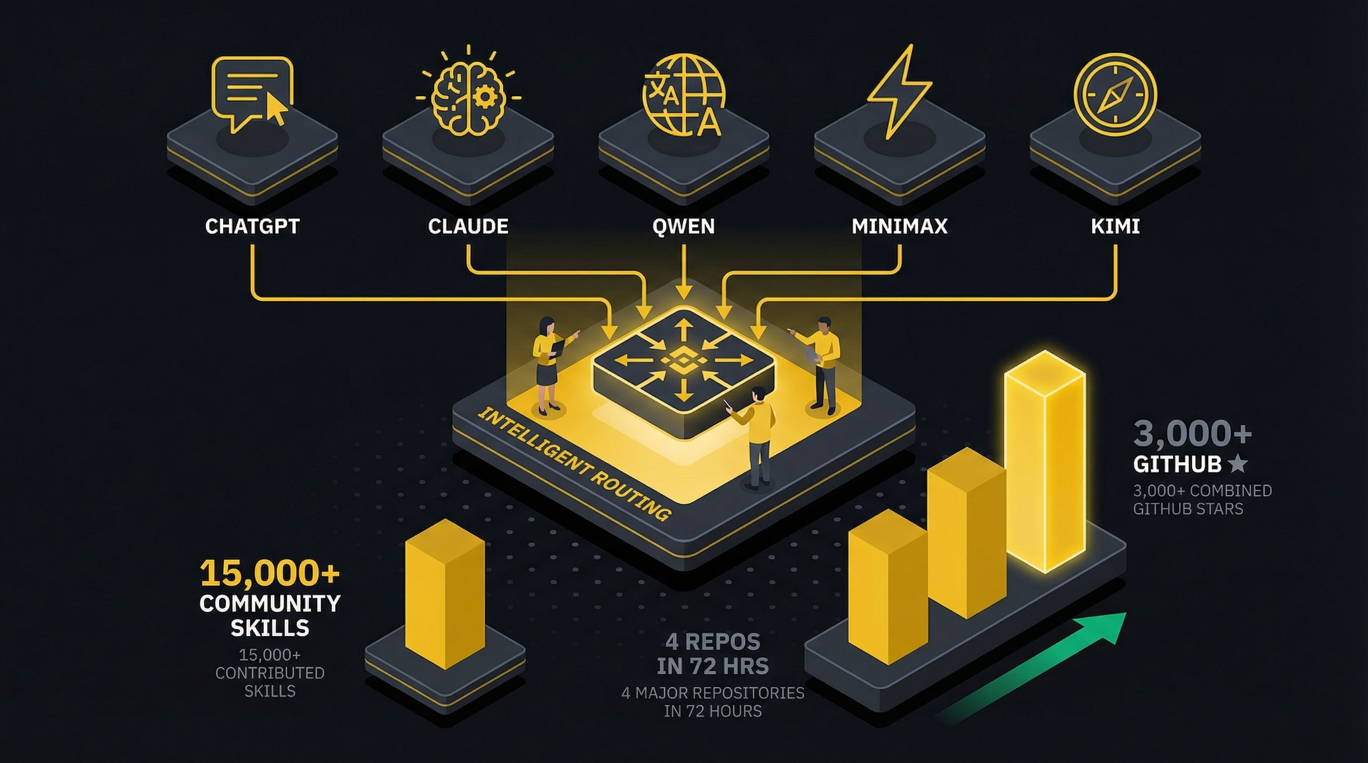 And behind all of this sits the OpenClaw ecosystem: 15,000+ community-contributed skills, with 4 major repositories launching in a single 72-hour window and racking up 3,000+ GitHub stars. This isn't a product — it's a compounding platform.