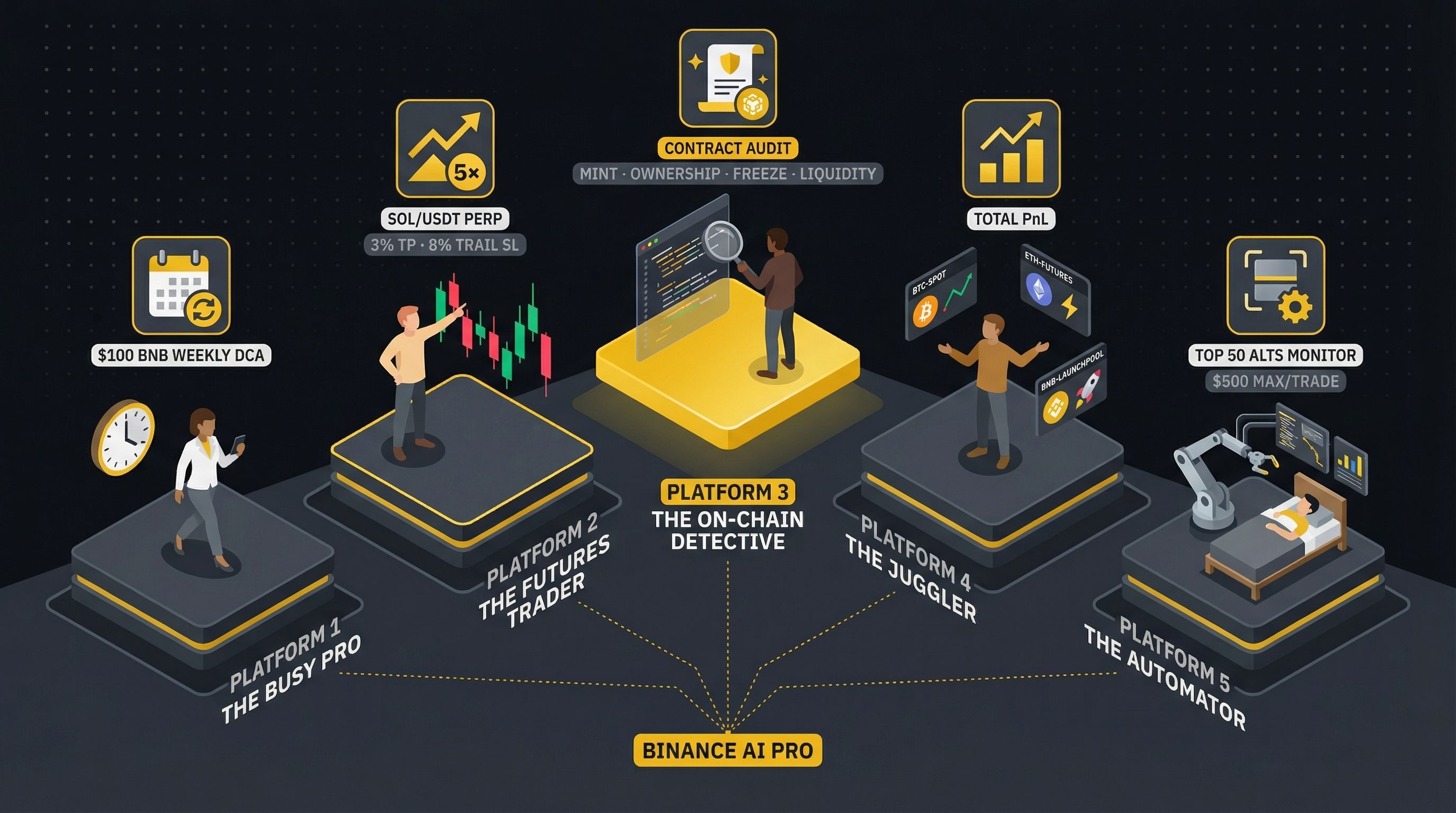 🏢 The Busy Professional: "Run my weekly DCA — $100 into BNB every Monday at market." Set it, forget it. No missed orders during meetings.