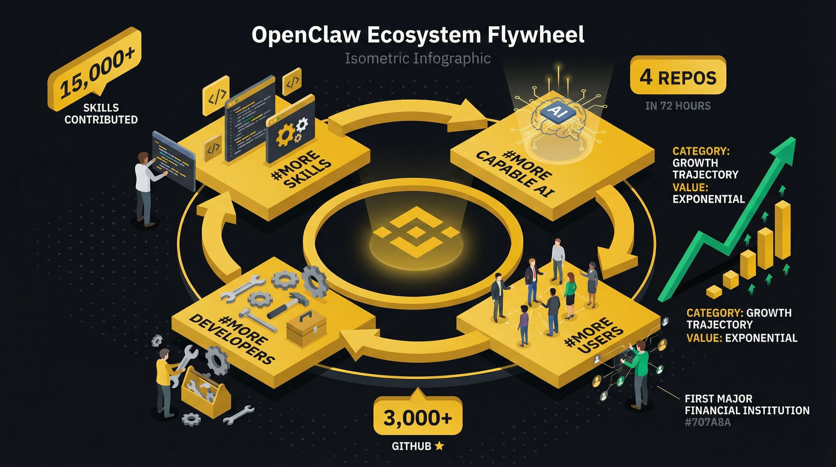 The OpenClaw ecosystem flywheel makes this even more compelling: More Skills → More Capable AI → More Users → More Developers → More Skills. Four major repos launched in 72 hours. 15,000+ skills contributed. Binance was the first major financial institution to launch a skills hub on the platform.