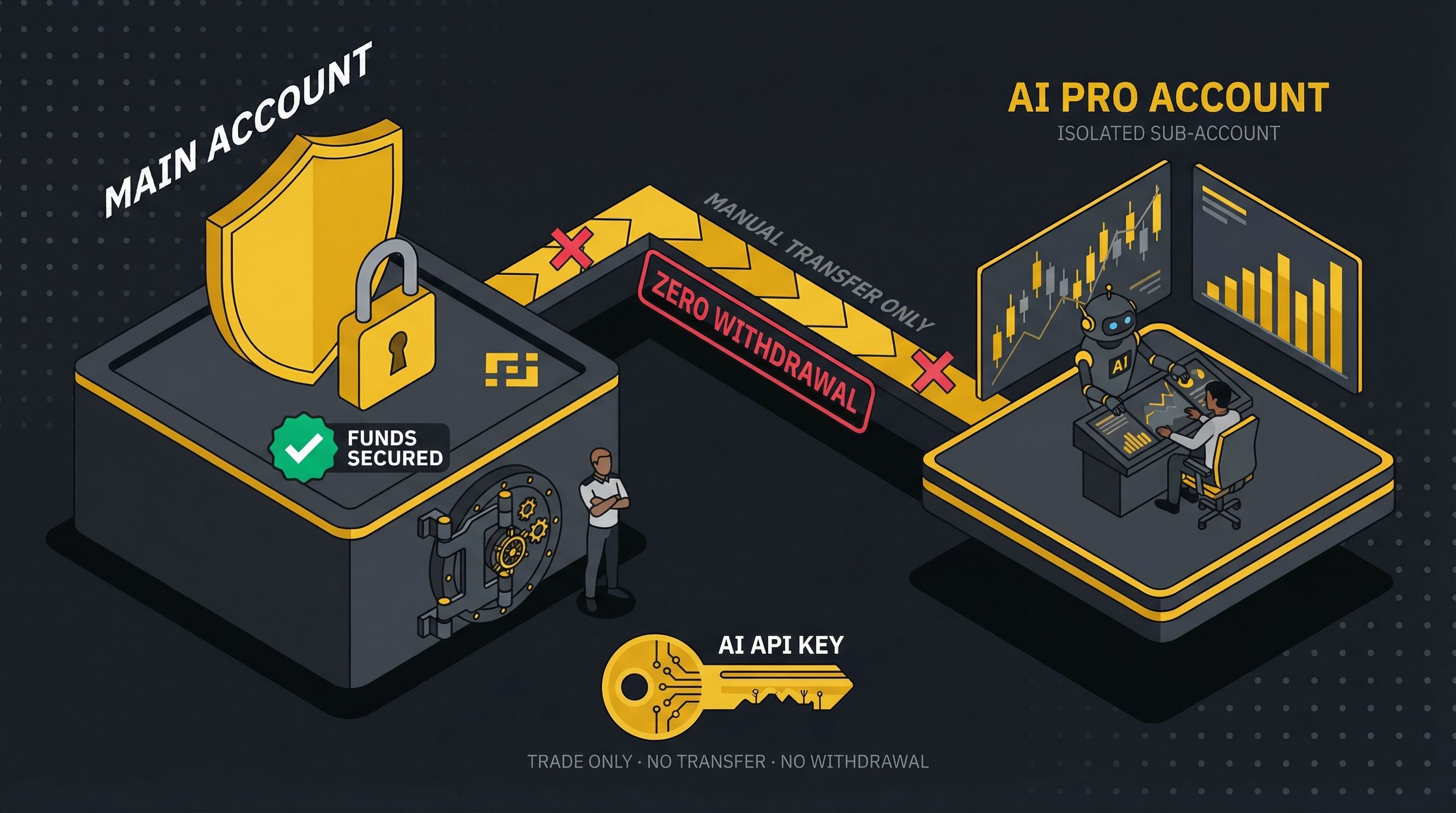 Think of it like giving a co-pilot full cockpit access — but removing their ability to open the emergency exit mid-flight. You decide how much capital to put in the sandbox. The AI plays within that sandbox. Your main account stays untouched.