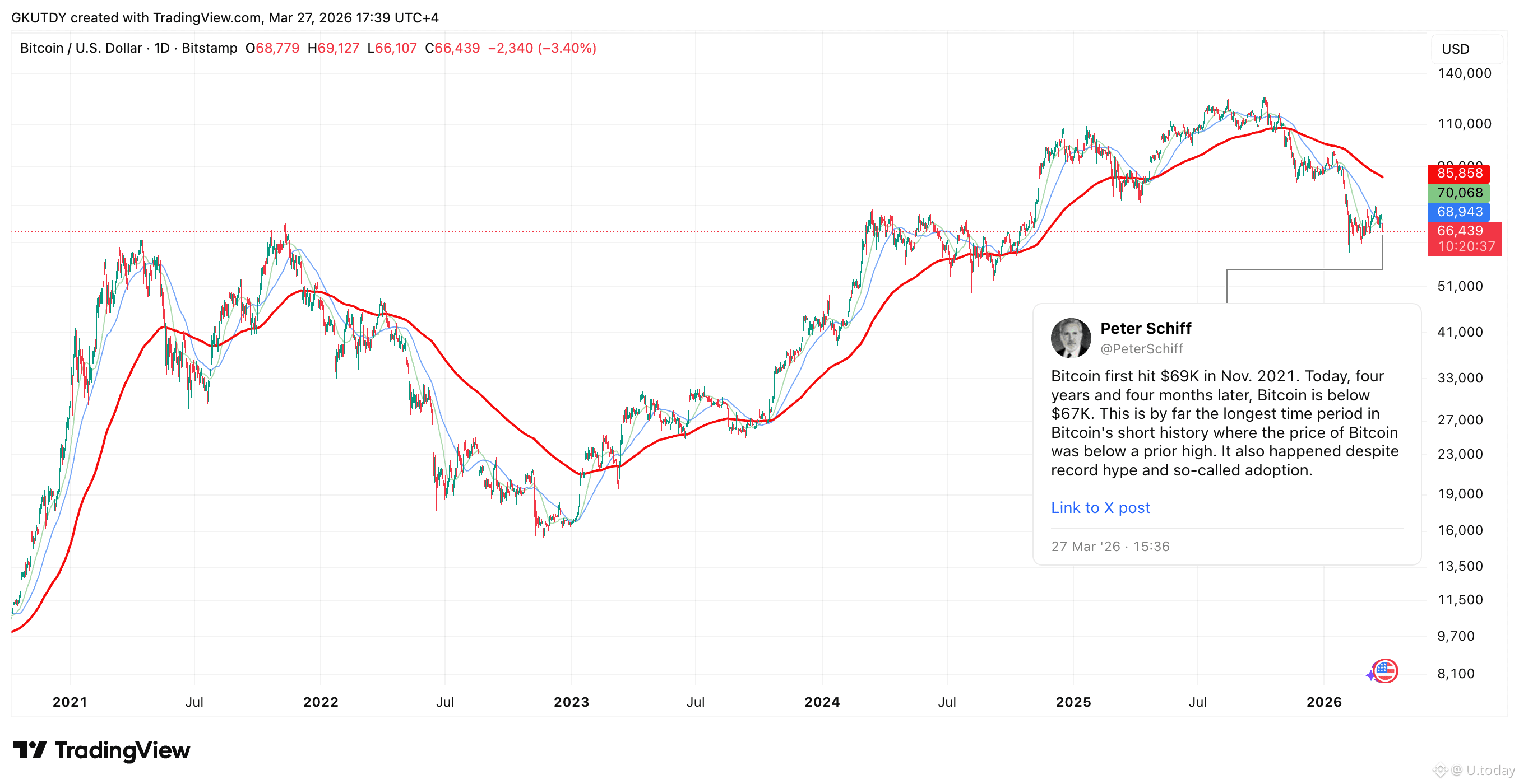 Schiff enfatiza que o Bitcoin alcançou pela primeira vez $69.000 em novembro de 2021, enquanto hoje, no final de março de 2026, o BTC está sendo negociado abaixo de $67.000. Como ele afirma, este é o período mais longo na curta história do Bitcoin, durante o qual seu preço permaneceu abaixo do anterior recorde histórico por tanto tempo.