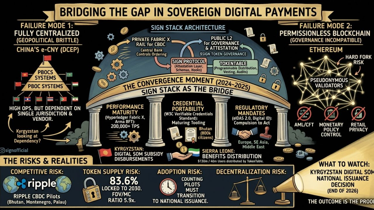 For a long time I've wondered why governments kept building digital payment infrastructure and getting it wrong in the same two ways. Either they built something fully centralized and operationally strong but geopolitically brittle — dependent on a single technology vendor, a single jurisdiction's legal framework, or a single payment rail that competitors or adversaries could cut off. Or they looked at permissionless blockchain and correctly identified that no government procurement office was signing off on infrastructure that a pseudonymous validator set could exit or fork. The gap between "digitize the currency" and "do it in a way that's actually sovereign" has been real and largely unsolved. And perhaps @SignOfficial has identified the specific moment in 2024-2025 when the two sides of that gap became close enough to bridge.