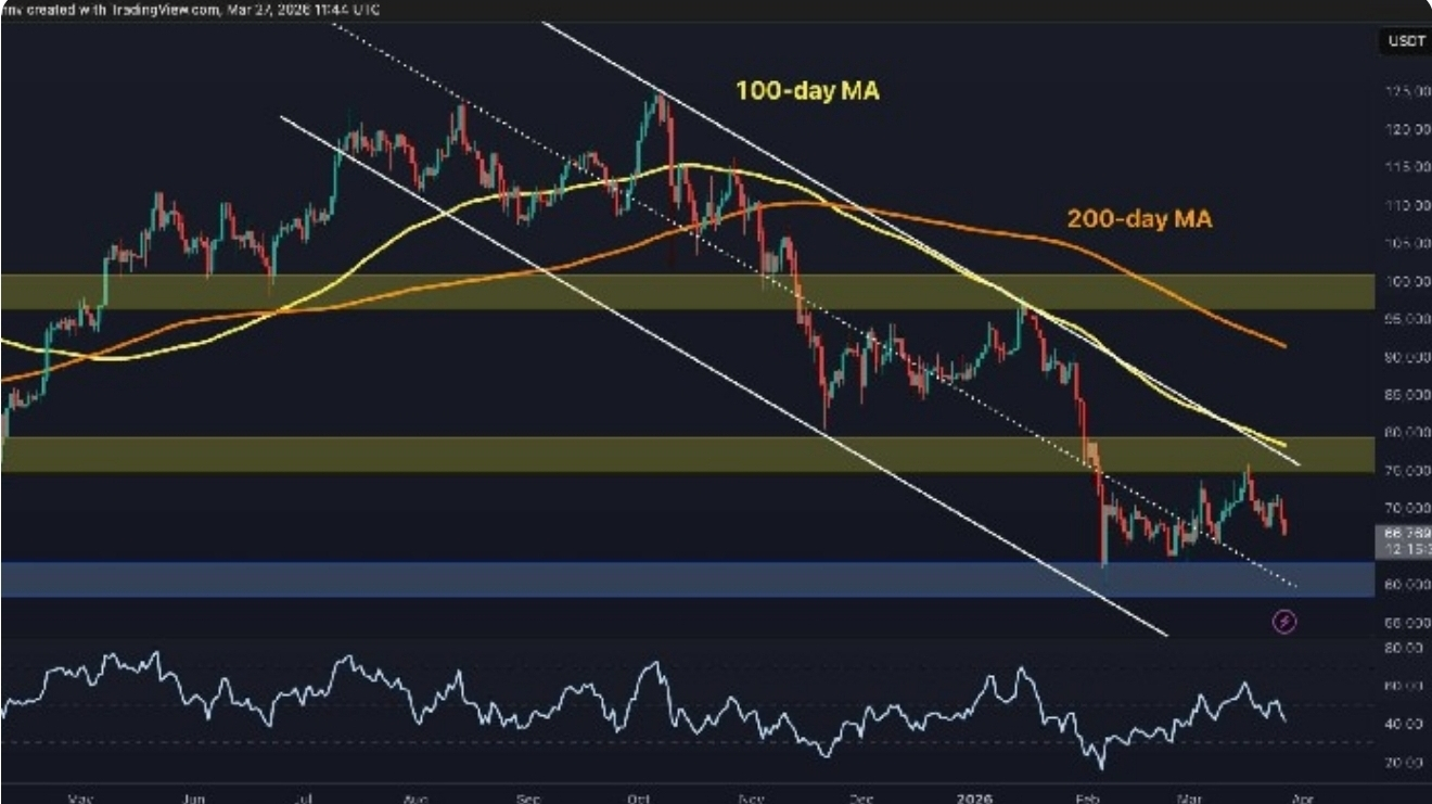 Com o RSI pairando perto de níveis de sobrecompra, a perspectiva de curto prazo permanece fraca. Um colapso confirmado poderia acelerar a queda em direção a $60K, adicionando pressão renovada ao mercado.