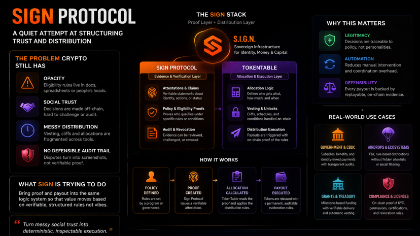 O que me faz voltar ao Sign é que ele não está tentando consertar a parte brilhante do cripto. Ele está se aprofundando na parte que geralmente é ignorada até que tudo comece a quebrar. Quem se qualifica. Quem tem acesso. Quem realmente merece a alocação. Quem pode provar qualquer um disso depois que o dinheiro se move. É aí que a fricção sempre aparece. Não no deck de apresentação. Não na postagem de anúncio. Na parte feia depois, quando as pessoas começam a perguntar por que esta carteira foi paga, por que aquela foi excluída e quem tomou a decisão.