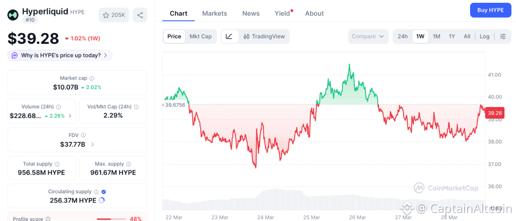 HYPE slipped 1,02% to $39.28 according to CoinMarketCap following BTC dropping below $67,000.