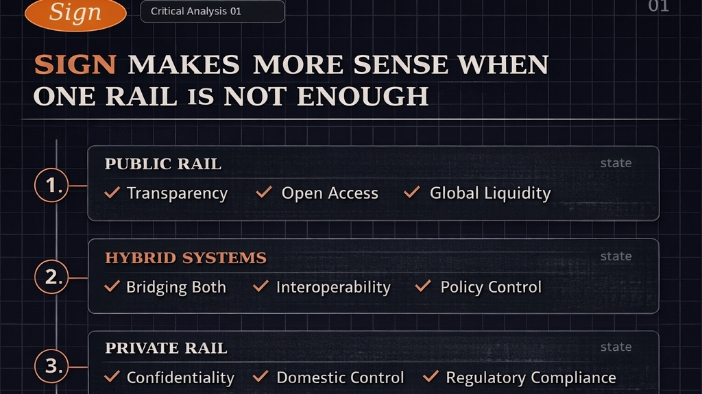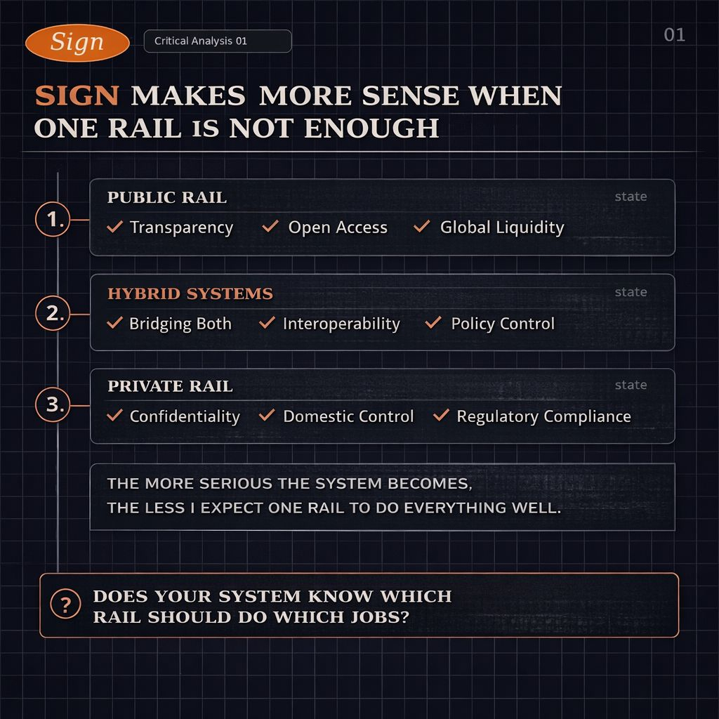 E, honestamente, essa é uma razão pela qual o SIGN parece mais crível para mim aqui. Ele não está tentando achatar restrições reais em uma narrativa fácil. Está começando da suposição de que os sistemas monetários ficam bagunçados no momento em que se tornam importantes. Um fluxo de varejo pode precisar de uma postura de privacidade muito diferente da camada de relatórios públicos. Um fluxo de transferência doméstica regulada pode não querer a mesma exposição que uma ferrovia de interoperabilidade entre sistemas. Um banco central ou regulador pode precisar de visibilidade supervisória, mesmo quando a confidencialidade do usuário final ainda importa. Esses não são casos extremos. Esses são o sistema.