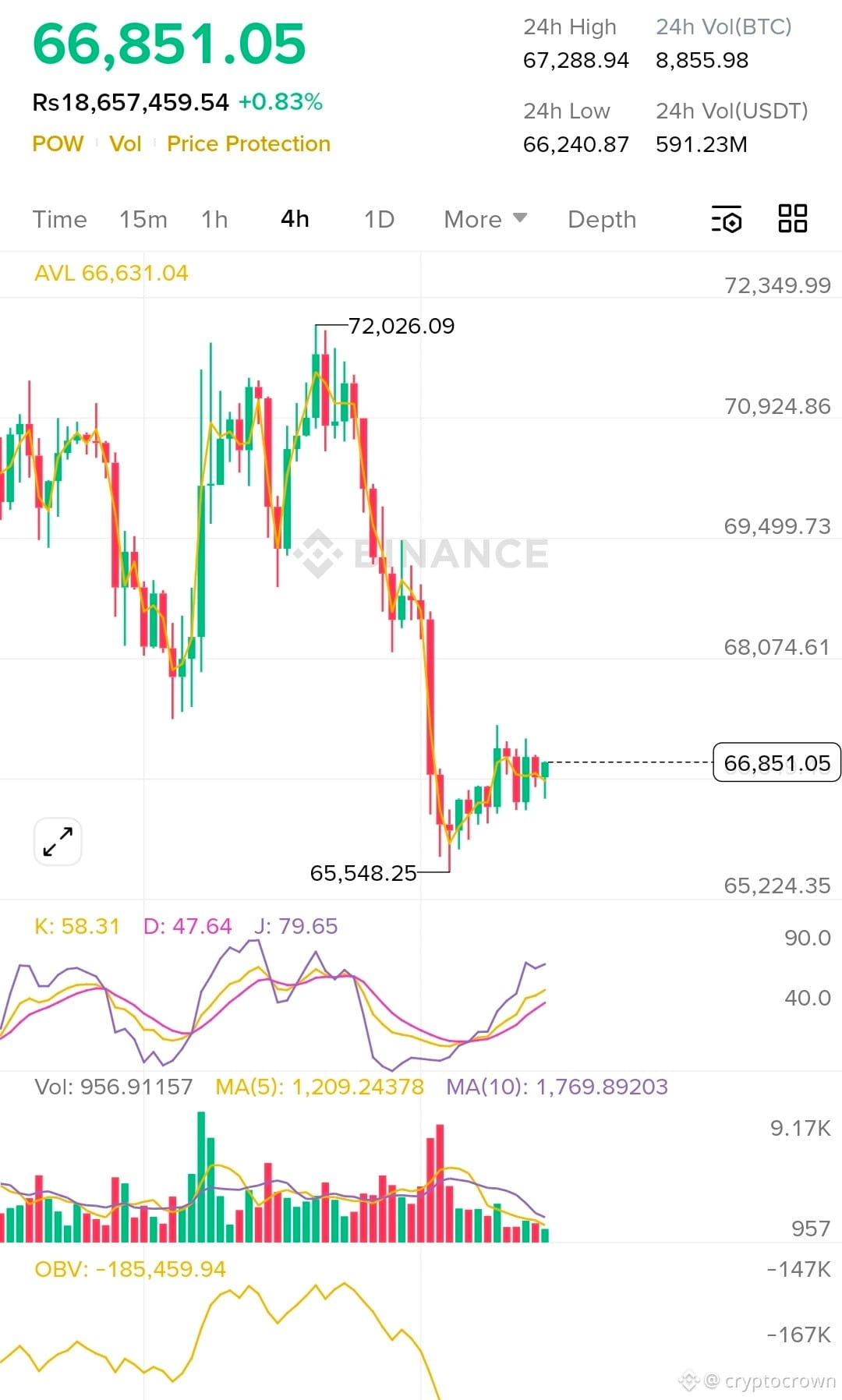 Bitcoin is currently trading around $66,800, showing a slight recovery after facing a strong rejection near the $72,000 level. The recent price action on the 4-hour chart indicates a sharp bearish move followed by a weak consolidation phase, which suggests that the market is still تحت pressure. Although a short-term support has formed around $65,500, Bitcoin is struggling to gain enough momentum to break above nearby resistance levels. The structure at the moment remains neutral to slightly bearish because the price is still forming lower highs and failing to reclaim key resistance zones.