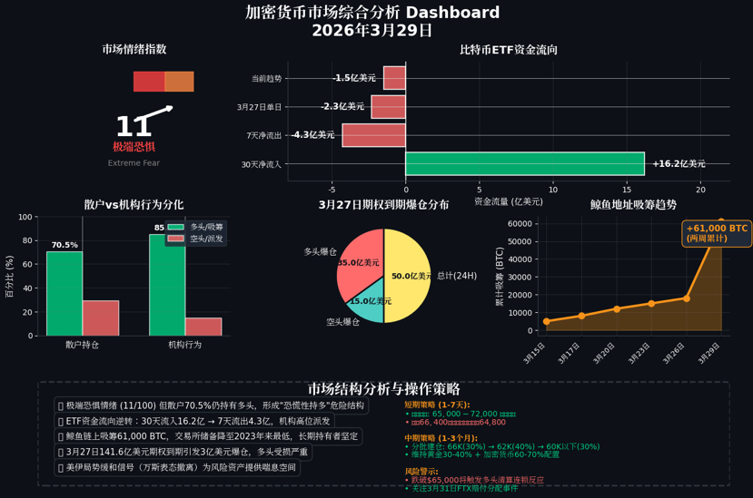 O mercado em 29 de março estava em uma típica "escuridão antes da aurora": uma sensação de medo extremo permeia, os varejistas são forçados a manter posições longas em perdas, enquanto os institucionais silenciosamente acumulam. A formação técnica é tendencialmente baixa, mas está severamente sobrevendida, o risco geopolítico diminui, mas a pressão macroeconômica persiste. Esse estado contraditório garante que a volatilidade se mantenha alta, mas também proporciona uma rara oportunidade de assimetria de risco e retorno para investidores racionais.