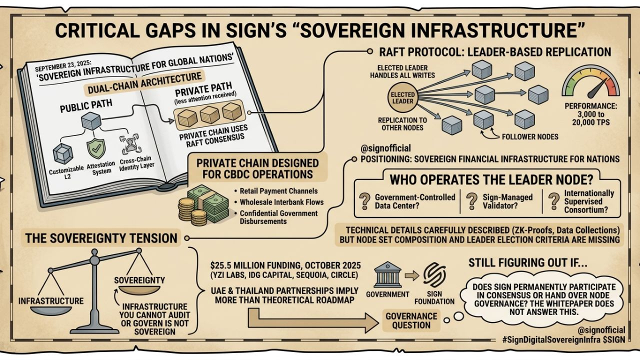 the whitepaper presents the dual-chain model as the sovereignty solution: governments get their own infrastructure, their own rules. but infrastructure you cannot independently audit or govern is not sovereignty in any meaningful sense. if the raft leader node is controlled by the sign team or a sign-appointed entity, then the government is running sign-defined infrastructure with sign-controlled consensus — not their own. that's not an unusual model in enterprise blockchain; it's how many national blockchain deployments actually work. but presenting it as sovereign infrastructure while leaving the governance structure unspecified is a tension worth naming, not smoothing over.