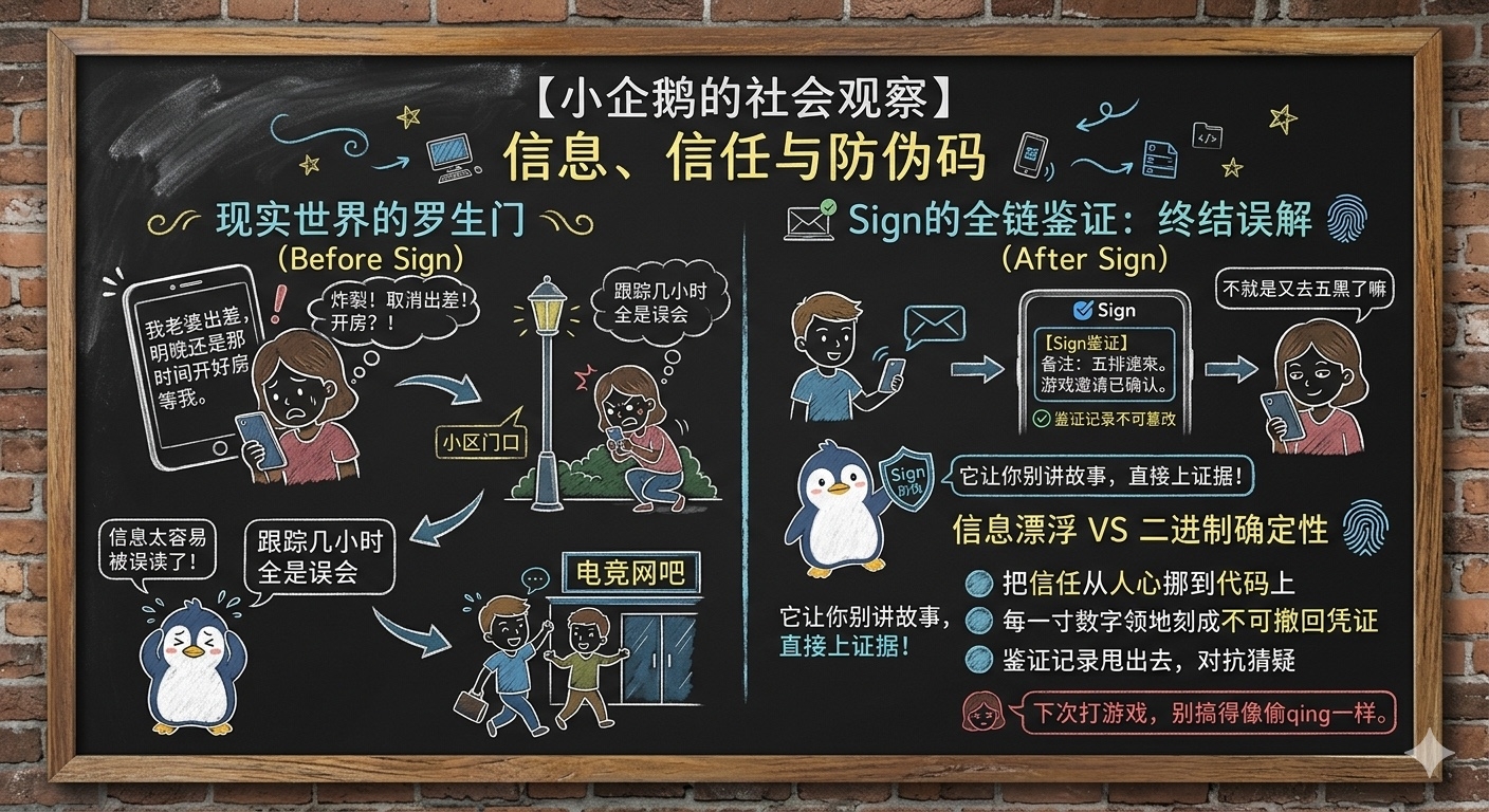 Pinguim pequeno vê tudo claramente. Sign não está ajudando você a enviar mensagens, está soldando um código de segurança digital ao seu comportamento social. Ele corta aquela ambiguidade vaga em uma certeza binária. Quando seu convite para o jogo, seu registro de transferência, cada uma de suas promessas, são totalmente verificadas através do Sign, aqueles chamados mal-entendidos perdem o solo de sua existência. Porque o que ele registra não é um trecho de texto, mas um estado factual que não pode ser alterado, com um contexto certo. Aos olhos do pinguim pequeno, $SIGN a parte mais severa disso é que ele move a barreira de confiança de corações humanos para códigos. Você não precisa implorar para que os outros acreditem em você, você só precisa jogar fora aquele registro de verificação que não pode ser negado. Ele faz com que cada centímetro do seu território digital seja marcado como um certificado vitalício que ninguém pode negar. Isso não é a mesma coisa que aqueles softwares sociais que podem ser revogados ou deletados a qualquer momento. No final, a parte mais trágica desta história não é a esposa, mas seu marido. Mesmo que ele acabe em um cybercafé, ele ainda terá que explicar por meia hora ao voltar para casa. Porque na realidade sem a verificação do Sign, você precisa usar sua voz e suor para combater a suspeita dos outros.