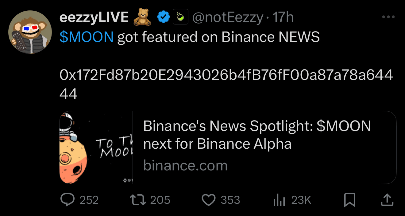 Aster esteve em uma onda de listagens, trazendo joias iniciais como $PALU, $PUP, $SZN, $WBULL e $YEPE para os holofotes — e o próximo nome que está sendo sussurrado em CT parece inevitável: $MOON.