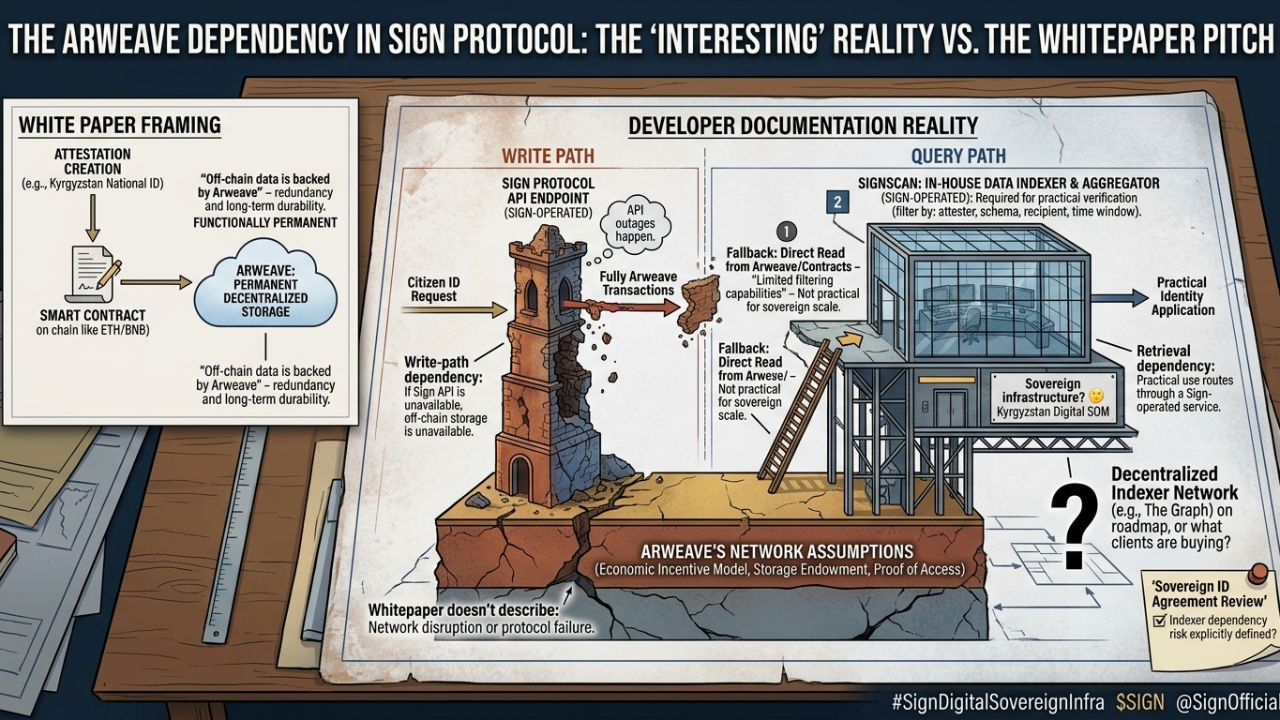 essa estrutura é tecnicamente precisa, mas praticamente incompleta. A permanência da arweave depende de seu próprio modelo de incentivo econômico, que usa um mecanismo de dotação de armazenamento para financiar mineradores a longo prazo. O protocolo é projetado para que, mesmo com a diminuição do custo de armazenamento ao longo do tempo, o rendimento da dotação cubra o custo contínuo de recuperação. Isso funciona — a arweave está em operação desde 2018 e demonstrou durabilidade significativa. Mas funciona como uma garantia em nível de rede, não como uma garantia em nível de transação. Um governo que implanta credenciais de identidade nacional no protocolo sign com a arweave como camada de armazenamento off-chain herda as suposições de rede da arweave, incluindo a suposição de que o próprio protocolo arweave permanece operacional e compatível com incentivos durante a duração da implantação. O whitepaper do sign não descreve o que acontece com os dados de credenciais off-chain se a arweave experienciar uma interrupção significativa da rede ou falha do protocolo.