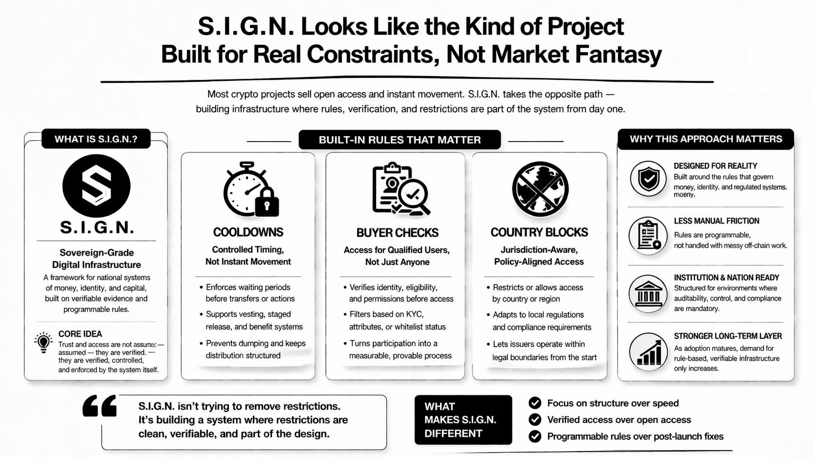 What I see here is a project built around friction. Not ignoring it. Not pretending everything onchain should be instant, open, and available to everyone everywhere. That fantasy still sells, sure. But in the real world, money moves with rules attached. Access comes with conditions. Distribution has limits. Geography matters. Identity matters. Timing matters. Most projects still write like those problems will magically disappear. I don’t think S.I.G.N. is making that mistake.