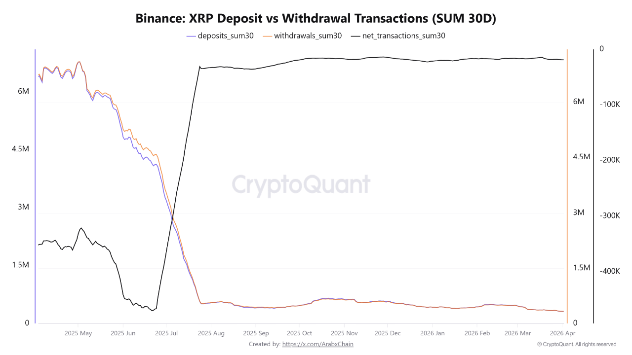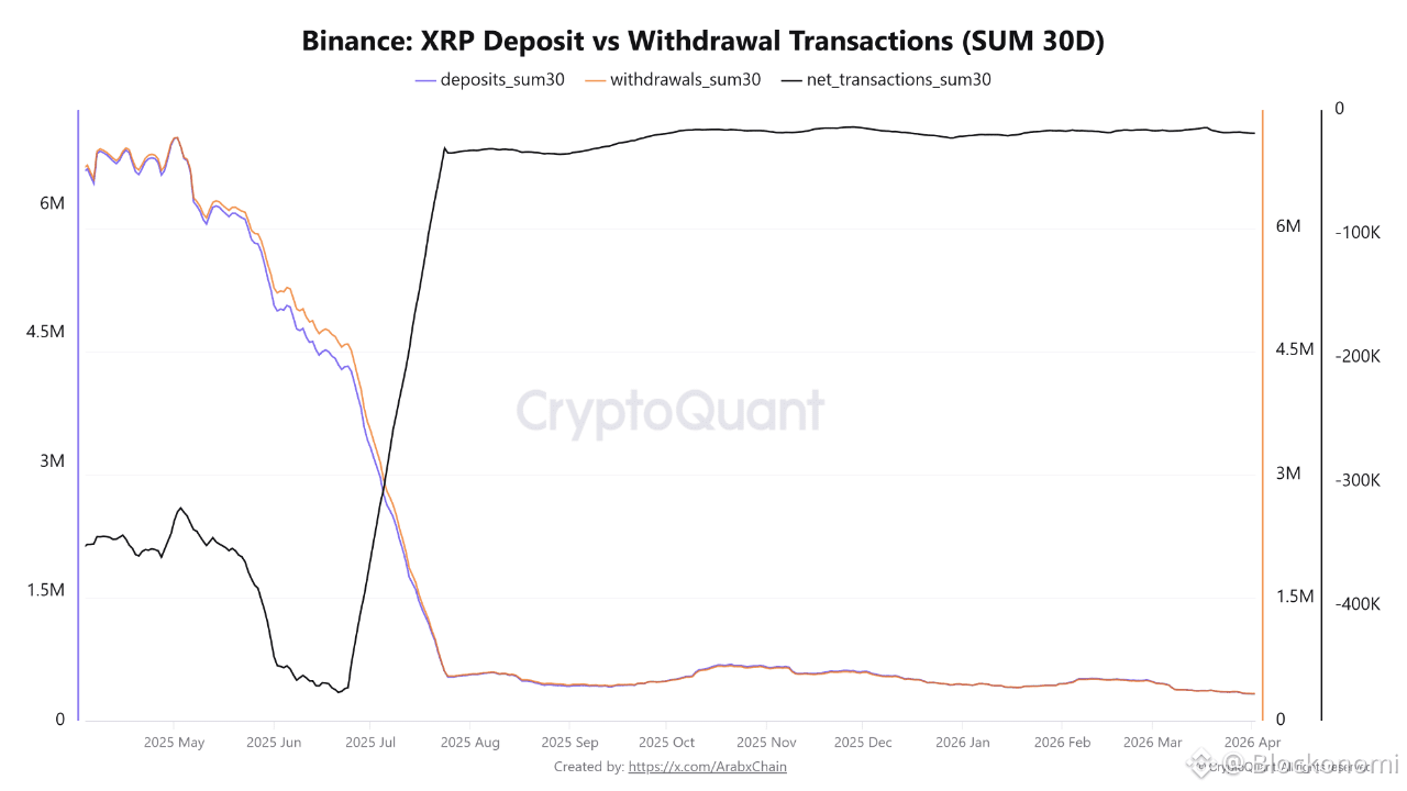 Os depósitos e retiradas de XRP na Binance foram consideravelmente mais altos no início do ano. Em certos momentos de 2025, o total de transações excedeu 6 milhões dentro de uma única janela de 30 dias.