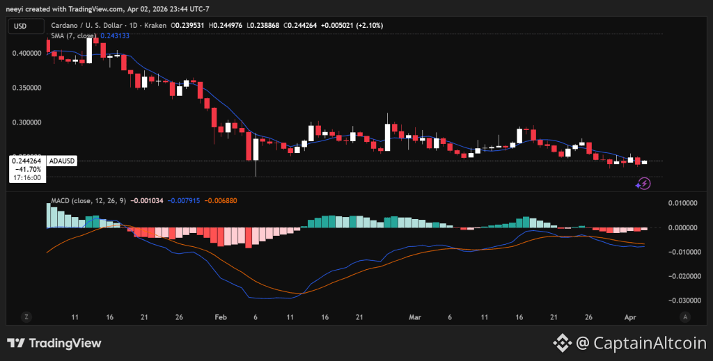 Recent price behavior adds more clarity. A look at the last 7 days shows a drop from about $0.27 to roughly $0.24, followed by a small bounce that failed to gain strength. Price has now returned close to the lows, trading around $0.244. That structure points to sellers stepping in whenever ADA attempts to recover.