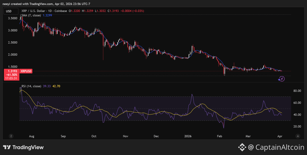 Recent price action shows a failed recovery attempt. XRP dropped to about $1.33, bounced toward $1.35, then slipped back near $1.32. That pattern reflects steady selling pressure at higher levels.