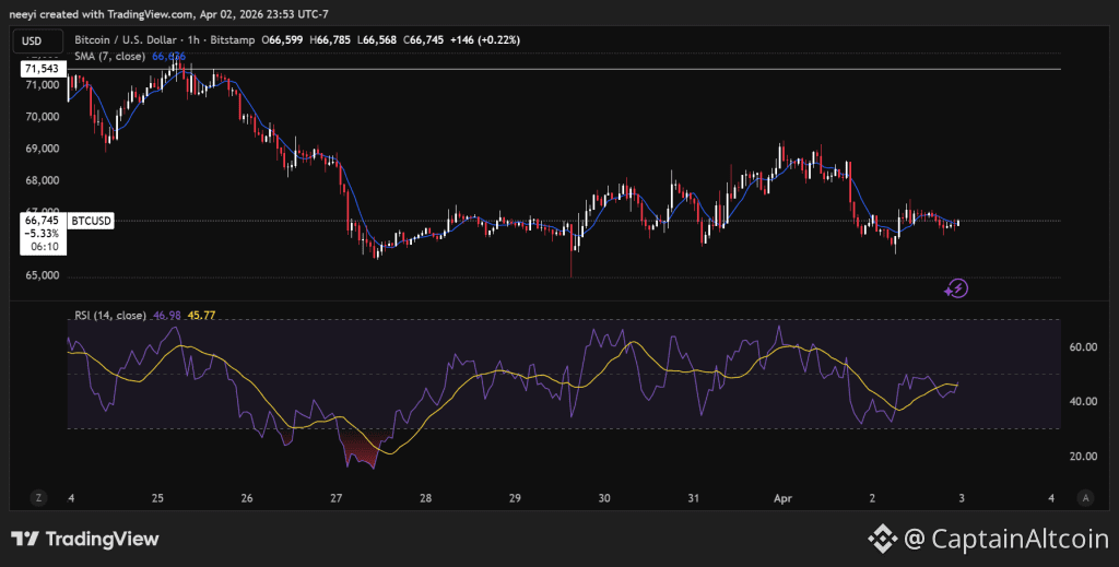 Metric Value Current Price $66,628 RSI (1h) 46 MACD Slightly stabilizing 7 Period SMA $67,000 30 Period SMA $66,748