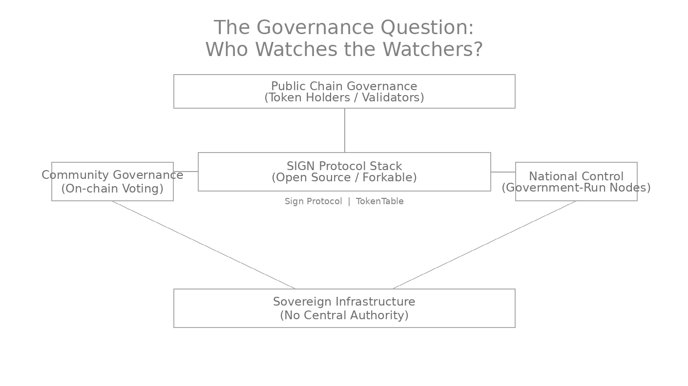 A arquitetura do projeto não é apenas técnica, é projetada com uma clara separação de poderes. A cadeia pública é governada por detentores de tokens através de votação em cadeia. As camadas de privacidade permitidas estão sob o controle de cada governo individual, não do SIGN. E os protocolos principais Sign Protocol, TokenTable são de código aberto e projetados para serem bifurcáveis se a comunidade algum dia discordar da direção.