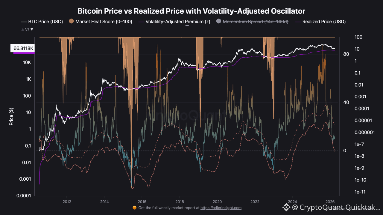 O Bitcoin permanece acima do Preço Realizado (~$54.1K), enquanto o prêmio ajustado pela volatilidade (z-score) permanece firmemente positivo em ~+11.
