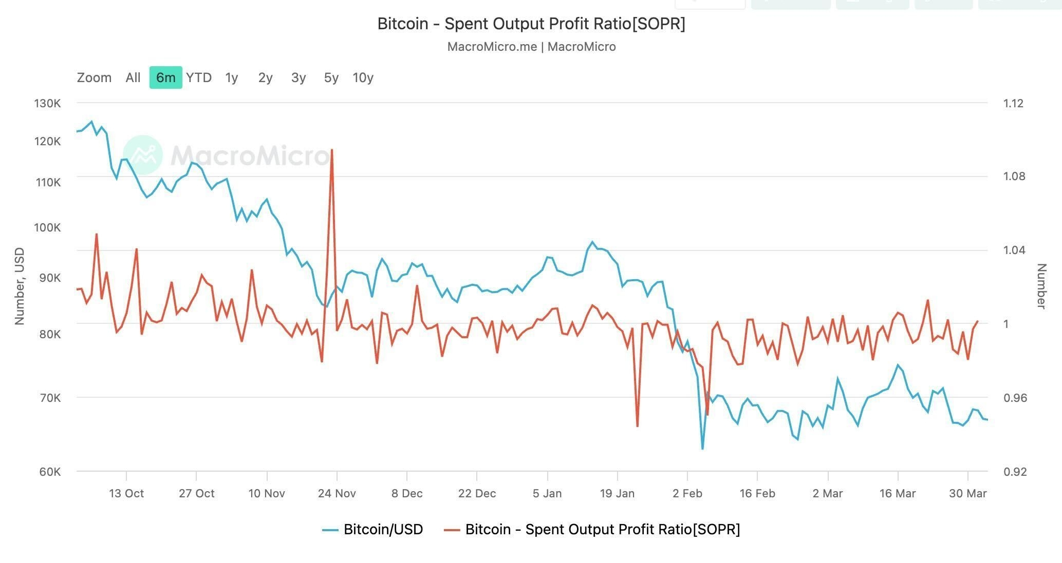 O comportamento on-chain também aponta para um ambiente cauteloso. Alguns detentores de Bitcoin que estavam recentemente no vermelho começaram a sair de posições à medida que os preços se aproximavam dos níveis de breakeven. Essa mudança foi refletida em indicadores de rentabilidade, como SOPR, que se aproximaram do neutro à medida que o Bitcoin negociava perto do nível de $68,000.