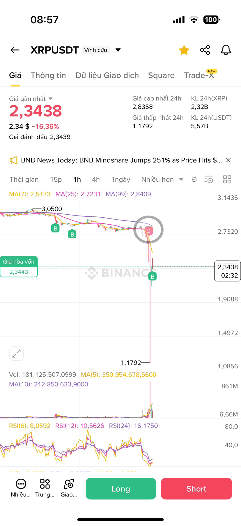 Naquela noite eu também estava com uma ordem longa como na imagem abaixo. Para ser sincero, eu dormi sem saber de nada até que de manhã acordei e fui verificar o aplicativo. No começo, pensei que o aplicativo estava lento porque os preços estavam caindo de forma insana. Vocês veem que o SL me salvou de queimar a conta.