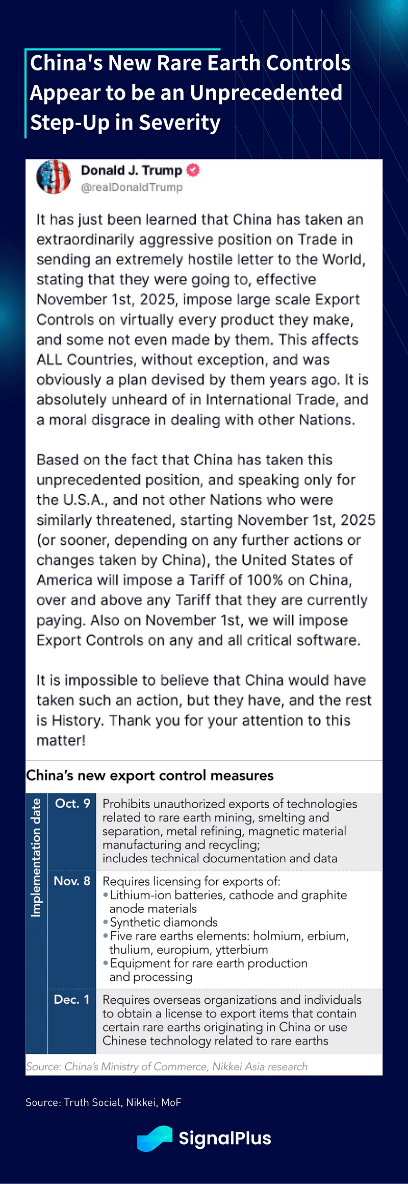 Olhando para frente, os mercados deram uma leve alta na segunda-feira devido à falta de escalada adicional de ambos os lados dos EUA e da China, e também devido aos feriados prolongados no Japão e nos mercados dos EUA. Embora a visão predominante seja que a recente escalada é apenas uma moeda de troca antes da reunião Trump-Xi (agora em questão), acreditamos que o impacto a longo prazo é que o tema do desacoplamento macro teve uma aceleração maciça. A proibição de metais raros aprimorada é uma escalada não trivial e destaca a eficácia decrescente de qualquer retaliação tarifária dos EUA.