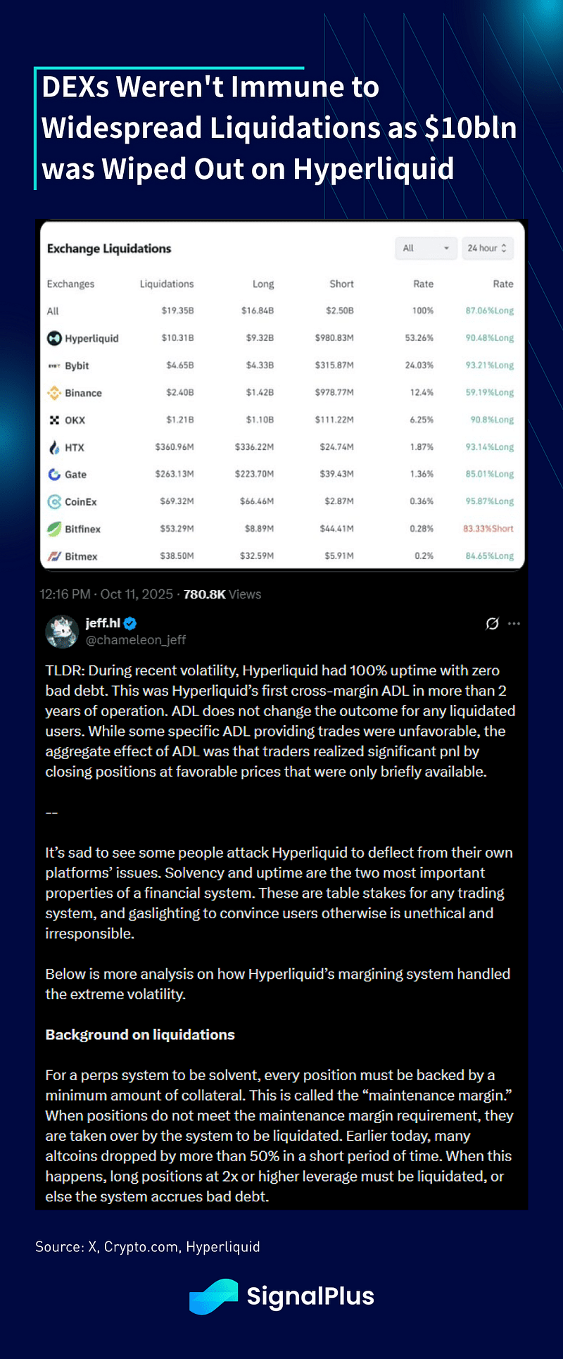 Para piorar as coisas, um salto significativo no tráfego de dados sobrecarregou a infraestrutura das exchanges, o que complicou ainda mais os mecanismos de liquidação automática com feeds de dados atrasados e ordens congestionadas. No entanto, esse problema não se limitou apenas aos principais CEXs, mas também foi visto em DEXs líderes como Hyperliquid, que 'liderou' a tabela de liquidação com mais de $10bln de capital eliminado on-chain em uma base de 24 horas. Os vácuos de liquidez são indiferentes a se seu capital está on-chain ou não, infelizmente.