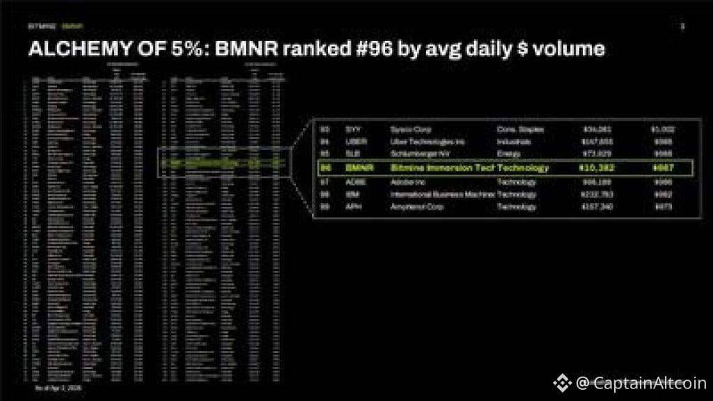 Bitmine is one of the most widely traded stocks in the US. According to data from Fundstrat, the stock has traded average daily dollar volume of $987 million (4-day average, as of April 2, 2026), ranking #96 in the US, behind Schlumberger (rank #95) and ahead of Adobe (rank #97) among 5,704 US-listed stocks (statista.com and Fundstrat research).