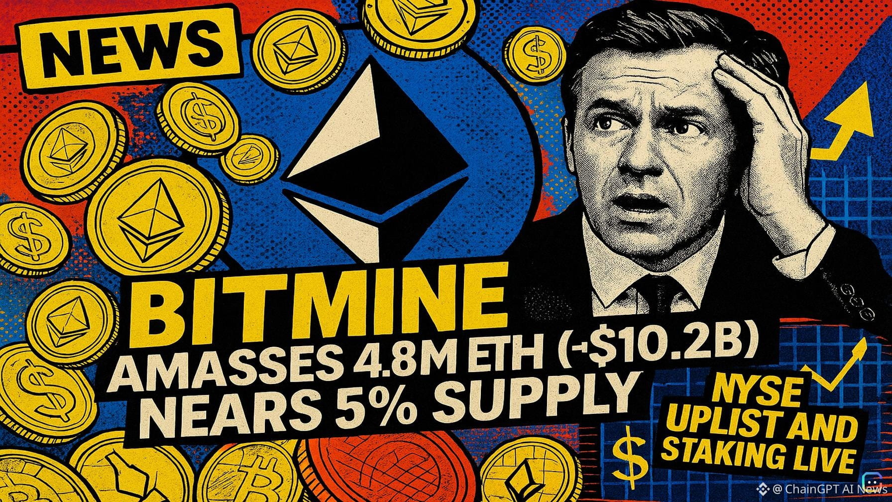 Bitmine Immersion Technologies (BMNR) said Monday it now holds 4.8 million ether (ETH) — roughly $10.2 billion at current prices — putting the company within striking distance of its stated target to own 5% of Ethereum’s circulating supply. The firm also announced an uplisting: Bitmine’s shares will begin trading on the New York Stock Exchange on April 9, moving up from the NYSE American. A treasury built on ETH Bitmine’s 4.8 million ETH represents about 3.98% of Ethereum’s roughly 120.7 million circulating tokens. The company has leaned into a treasury-accumulation strategy similar to firms that have pursued large bitcoin treasuries, buying aggressively as crypto prices have softened. In the past week alone Bitmine added 71,252 ETH — its fastest weekly buy pace since late December, according to Chairman Tom Lee. Overall crypto and cash reserves stand at $11.4 billion, including $864 million in cash, 198 BTC, and smaller equity stakes in Beast Industries and Eightco Holdings. Staking turns ETH into recurring revenue Where Bitmine diverges from bitcoin-focused treasury plays is staking. Of the 4.8 million ETH it holds, 3.33 million are already staked via Mavan, the company’s institutional-grade validator network that began operating Monday. That staked position is valued at about $7.1 billion and, at a 2.78% yield, is generating roughly $196 million in annualized staking revenue today. Bitmine projects that if it stakes its entire ETH position, annual rewards could reach about $282 million — creating a recurring income stream that pure bitcoin treasuries don’t capture. “ETH is the wartime store of value,” Lee said in the announcement, noting that ether has gained 6.8% since the Iran conflict began — outperforming the S&P 500 by 1,130 basis points and gold by 1,840 basis points in that period. Market profile and investor base Bitmine’s market footprint is growing: it is now the 96th most traded stock in the U.S., with average daily volume around $987 million, placing its liquidity between names like Schlumberger and Adobe. Institutional and crypto-native investors in its shareholder base include ARK Invest, Founders Fund, Pantera, Galaxy Digital and Kraken. Why this matters Bitmine’s push highlights two trends: corporates turning treasuries into public narratives to signal conviction, and the evolving advantage of staking-enabled crypto treasuries that can generate yield. With the NYSE uplisting and its validator network now live, Bitmine is positioning itself as both a large-scale ETH accumulator and an operational staking provider — a hybrid that changes the economics of holding crypto on a corporate balance sheet. Read more AI-generated news on: undefined/news