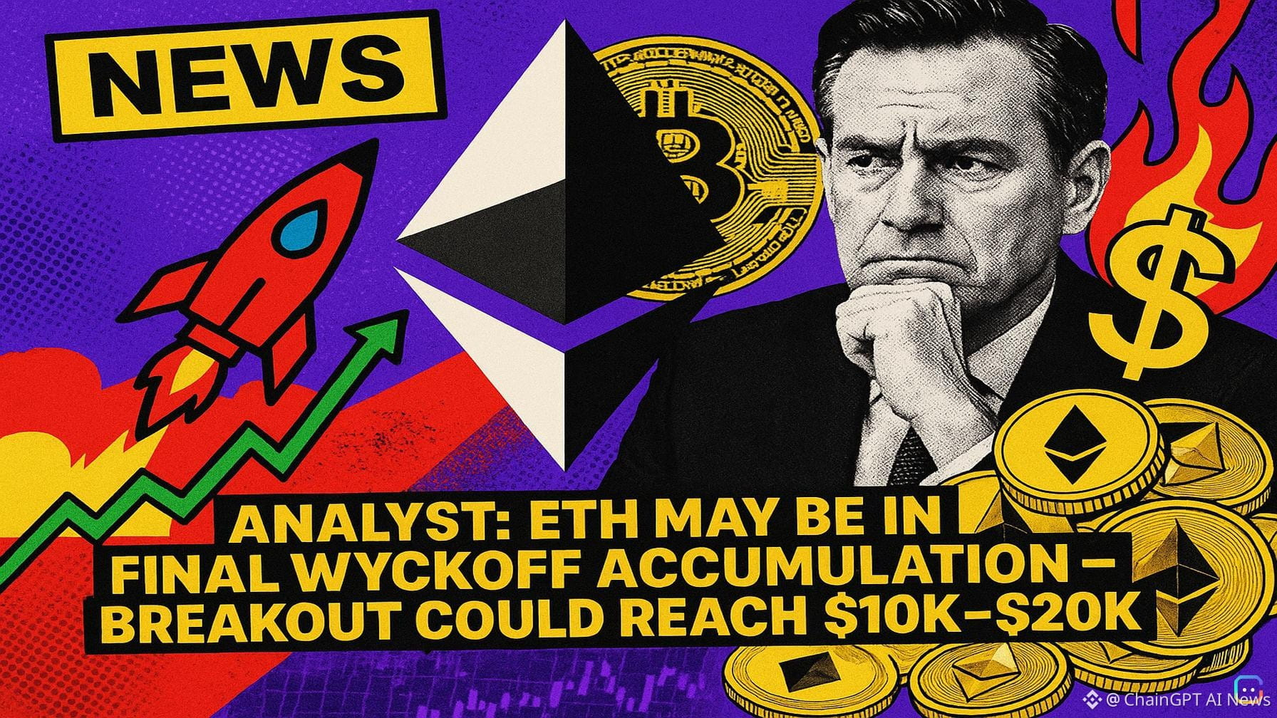 A crypto analyst on X is arguing that Ethereum’s recent weakness could be the last phase of a multi-year accumulation — and that a dramatic upside run could follow. Who’s making the call Crypto Patel posted a zoomed-out weekly ETH/USDT chart on X laying out a Wyckoff-style structure that, in his view, maps Ethereum’s price action since 2024 and points to an extended accumulation zone. How the chart reads (Wyckoff terms simplified) - Early 2024: Selling Climax (SC) — a sharp low. - Within two months: Automatic Rally (AR) up to resistance. - Mid-2024: Secondary Test (ST) revisiting the selling climax area. These events, Patel says, established the current trading range whose top sits near ~$4,700 and whose primary floor is Support 1 at $1,549. Springs, tests and the current picture Patel marks two notable downside wicks as Spring 1 and Spring 2 around the lower boundary. Spring 1 (mid-2025) briefly punctured Support 1 before recovering and even pushing to a new high just above the $4,700 resistance. Since that peak, ETH has slid back and Patel labels the present action Spring 2, currently just above Support 1. If Support 1 fails, the analyst points to a secondary buying zone — Support 2 at $1,065. He highlights the $1,800–$1,400 range as the ideal accumulation window if Ethereum moves down toward Support 2. The bullish scenario and timeline Patel’s roadmap projects that once ETH exits this accumulation regime and clears the major resistance near $4,700, a multi-stage rally could unfold into late 2027–2028. The scenario he plots: - A push up to ~$4,700, - A pullback below ~$4,000 to consolidate the breakout, - Then a parabolic extension to new all-time highs, with staged targets at $10,000, $15,000 and as high as $20,000. Context and numbers - Current price (per the post): roughly $2,100–$2,135 — about 57% below its peak. - A $20,000 target would imply roughly a 10x move from today’s price. - The chart noted ETH’s recent 24-hour move of +4.8%. Bottom line Patel’s view frames Ethereum’s weakness as part of a Wyckoff accumulation sequence that could set the stage for a long-term rally, but the thesis hinges on key support holding and a decisive breakout above the ~$4,700 resistance. As with any technical read, this is one scenario among many and depends on market dynamics over the coming years. Read more AI-generated news on: undefined/news