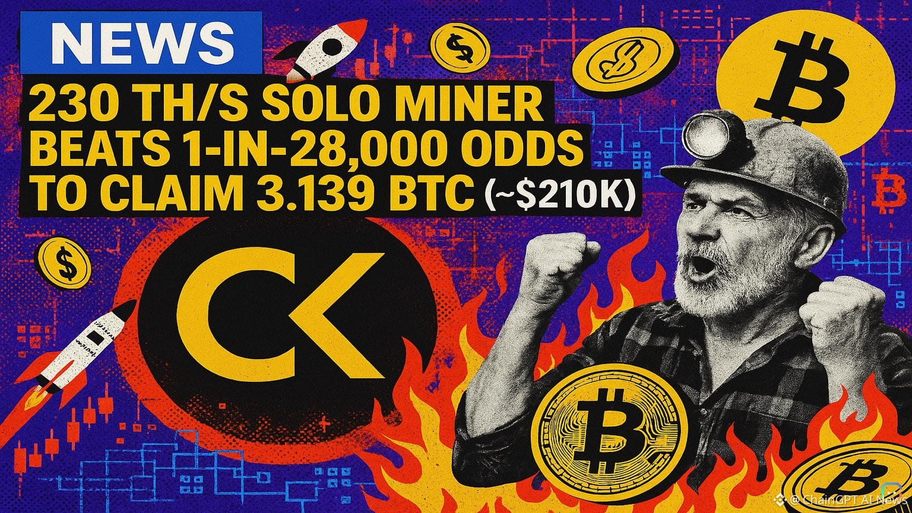 A lone miner running roughly 230 terahashes per second (TH/s) beat long odds Thursday to validate Bitcoin block 943,411 and collect 3.139 BTC — about $210,000 at current prices. The win came through solo.ckpool.org, the anonymous solo-mining pool founded in 2014 that allows operators to keep full block rewards minus a 2% fee. CKPool developer Con Kolivas confirmed the payout on X and noted the miner had roughly a 1-in-28,000 chance of finding a block on any given day. At ~230 TH/s, the rig represents only about 0.00002% of Bitcoin’s estimated network hashrate — around 1 zettahash per second (ZH/s) in early April — a footprint consistent with a small cluster of home ASICs rather than an industrial farm. By comparison, public miner Riot Platforms runs more than 30 exahashes (EH/s) — roughly 130,000 times the hashrate of this solo winner. This is the 312th solo block recorded on CKPool and the first since Feb. 28, snapping a 33-day drought. Solo pools overall have found just 20 Bitcoin blocks in the past 12 months, distributing a combined 62.96 BTC — approximately one solo block every 18.7 days on average, with the longest gap in that period being 58 days. The surprise paydays for tiny miners are part of a recurring pattern this cycle. In December, a ~270 TH/s miner beat roughly 1-in-30,000 daily odds to claim about $285,000. In November, an operator with just 6 TH/s — the output of a single older ASIC — defied roughly 1-in-180 million odds to secure nearly $265,000. And in late February, someone turned about $75 of rented cloud hashrate (pointing ~1 PH/s at CKPool for a few hours) into roughly $200,000. These events underscore the role of randomness in Bitcoin mining: even very small miners can occasionally hit the jackpot, preserving a sliver of decentralization in a landscape otherwise dominated by massive, industrial-scale operations. Read more AI-generated news on: undefined/news