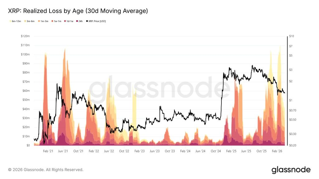 Os dados da Glassnode mostram um aumento acentuado nas perdas realizadas em várias coortes de detentores, particularmente nas faixas de idade de 1d–1w e 1w–1m, indicando que compradores recentes estão saindo de posições com prejuízo. Historicamente, esses aglomerados de perdas realizadas tendem a ocorrer perto de fundos locais, à medida que mãos mais fracas saem e mãos mais fortes absorvem a oferta.