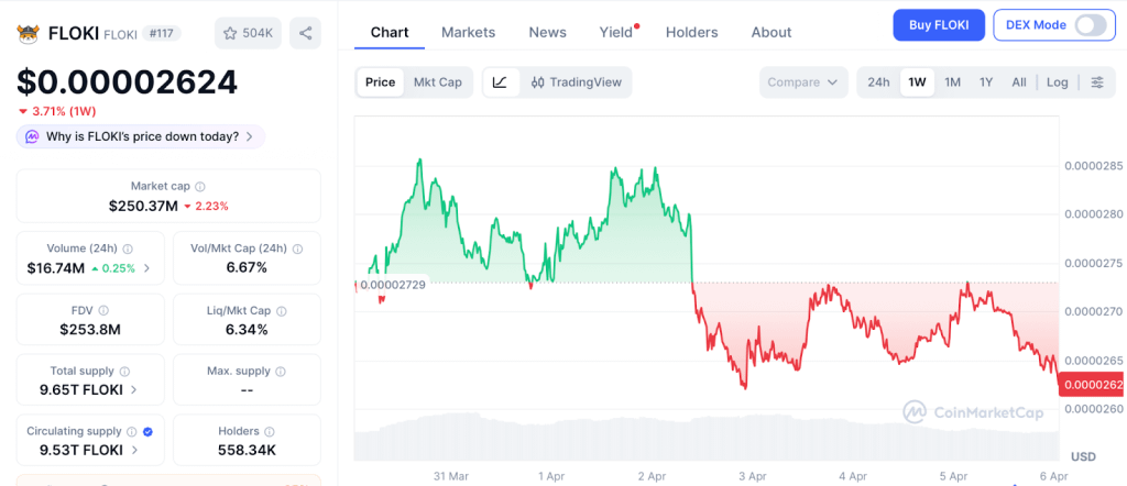 FLOKI está perto de $0,000026 em 6 de abril, preso abaixo de todas as médias móveis chave com pressão de baixa em todos os períodos de tempo segundo a CoinMarketCap. Pools de staking mantêm $48,6 milhões de 460.000 participantes, mas o gráfico ainda não recompensou esse compromisso.