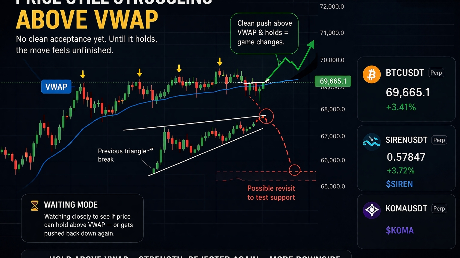 For now, the market appears undecided. A confirmed move above VWAP, followed by stability, could signal a meaningful shift in momentum. That would likely open the door for a stronger upward move.