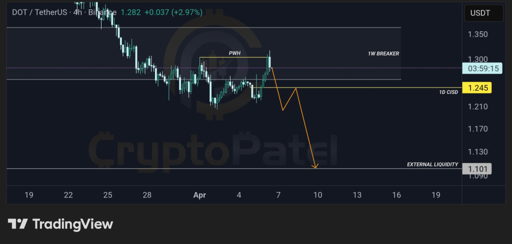 Uma análise mais detalhada da estrutura de preço do DOT mostra uma clara rejeição após o preço ter se movido para uma zona de prêmio de um período de tempo mais alto. Essa zona se alinha com um nível de quebra semanal, que frequentemente atua como uma forte resistência durante condições de mercado bearish.