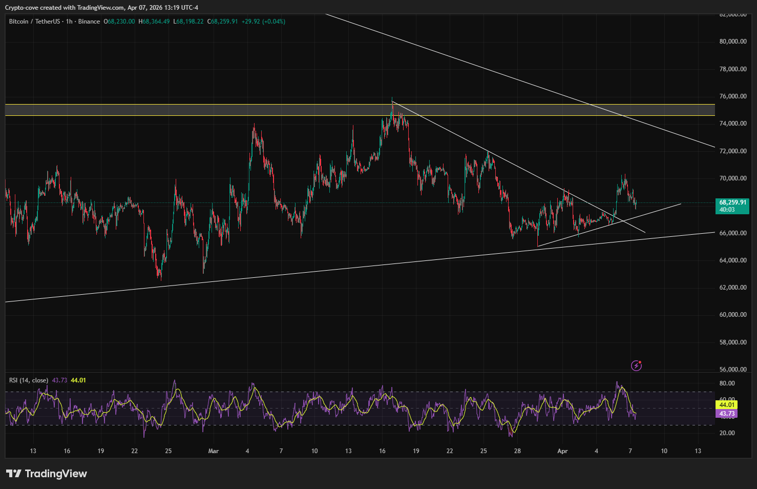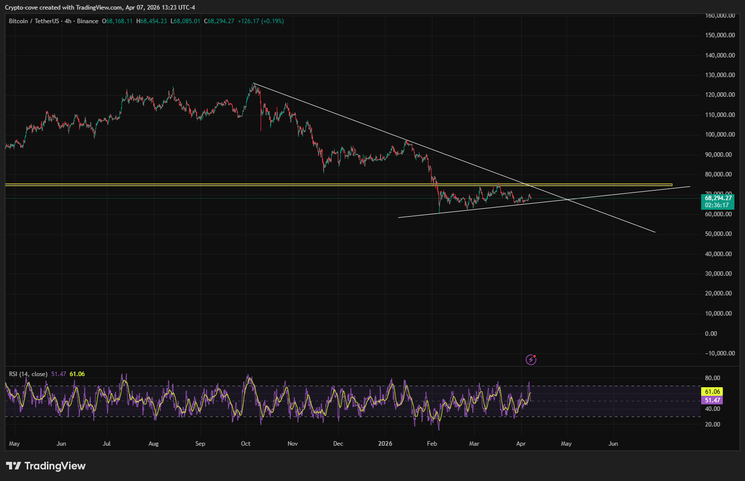 Se você ampliar o gráfico do BTC em um intervalo de tempo de 4h ou 1d, verá que o BTC está seguindo uma tendência de baixa... em um intervalo de tempo mais curto, o BTC é otimista, mas em um intervalo de tempo mais longo, o BTC é pessimista... sim, o BTC pode ir novamente para o nível de 74000-75000$ e então o BTC enfrentará uma resistência de tendência de baixa significativa, depois poderemos ver uma enorme volatilidade... Agora o mercado está lento porque está em uma zona de consolidação. Se o BTC continuar seguindo essa tendência de baixa, então veremos um grande despejo do nível de 74k-75k...