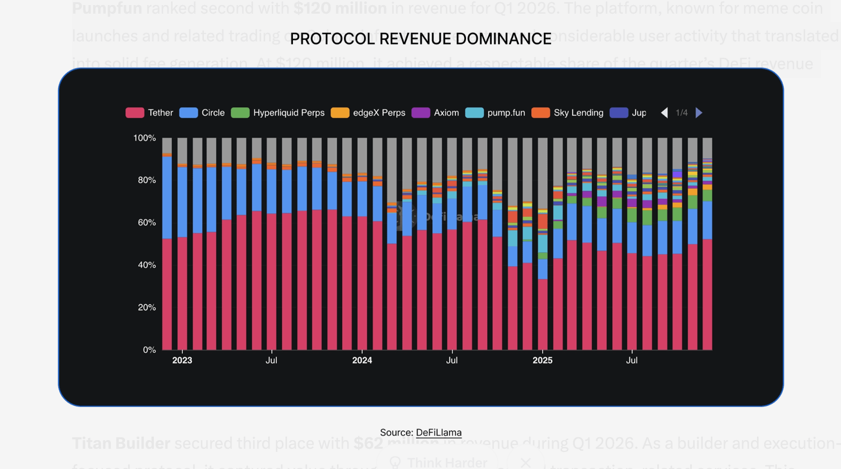 No geral, os dados do Q1 2026 mostram um claro nível superior na geração de receita DeFi. A forte liderança da Hyperliquid a $192 milhões destaca o poder de locais de execução de alto volume. Os $120 milhões da Pumpfun e os $62 milhões da Titan Builder completam o pódio, refletindo diferentes forças no ecossistema. Esses números fornecem uma visão direta da captura de valor durante o trimestre.