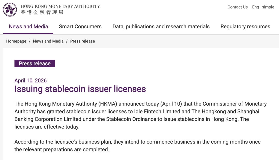 Hong Kong Concede Licenças aos Primeiros Emissores de Stablecoin ao HSBC, Idle Fintech