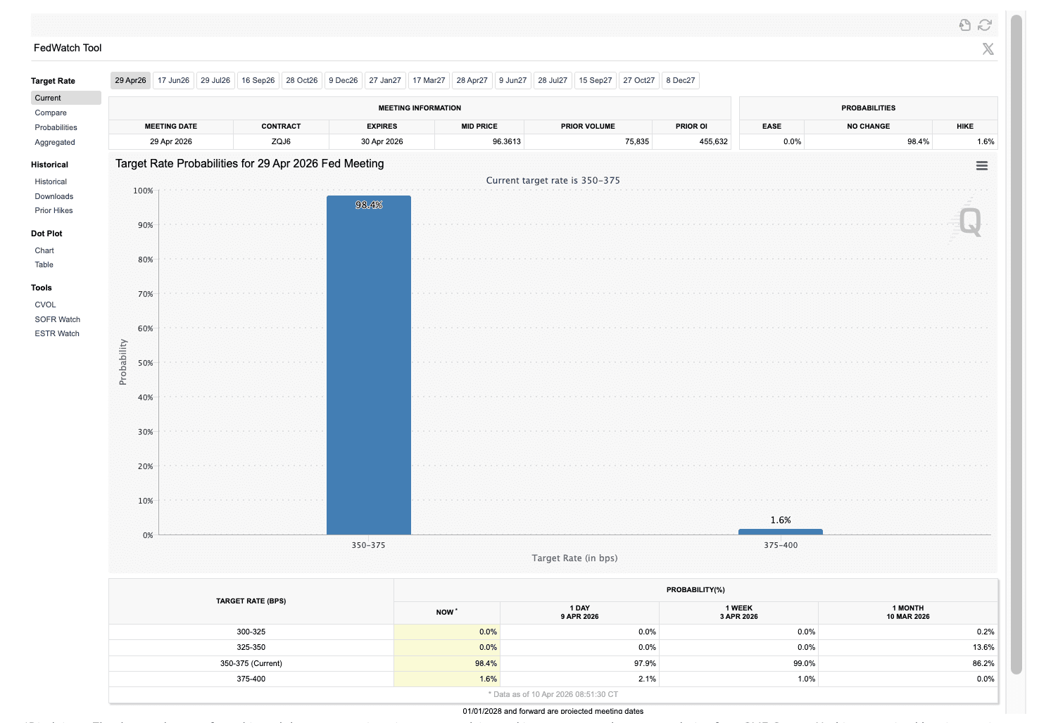 A inflação nos EUA disparou 0,9% em março—o ritmo mais rápido desde 2022—impulsionada em grande parte pelo aumento dos preços do petróleo, reforçando um ambiente de taxa maior por mais tempo, à medida que os mercados precificam uma probabilidade de 98,4% de uma pausa do Fed. Apesar do aumento, a inflação subjacente permanece contida, sugerindo pressão impulsionada por energia ao invés de superaquecimento generalizado.