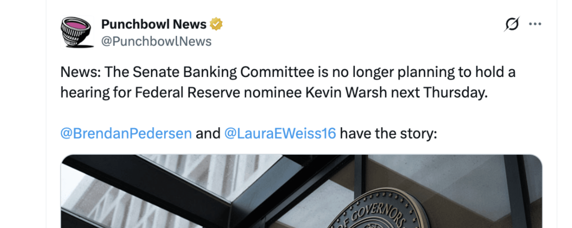 O Comitê Bancário do Senado cancelou a audiência de confirmação para o candidato a presidente do Fed, Kevin Warsh, criando incerteza em torno da liderança futura do Fed. Os motivos permanecem não divulgados, deixando os mercados especulando sobre possíveis implicações. O desenvolvimento pode impactar as expectativas em torno da direção da política monetária. Os investidores estão monitorando de perto os próximos passos.