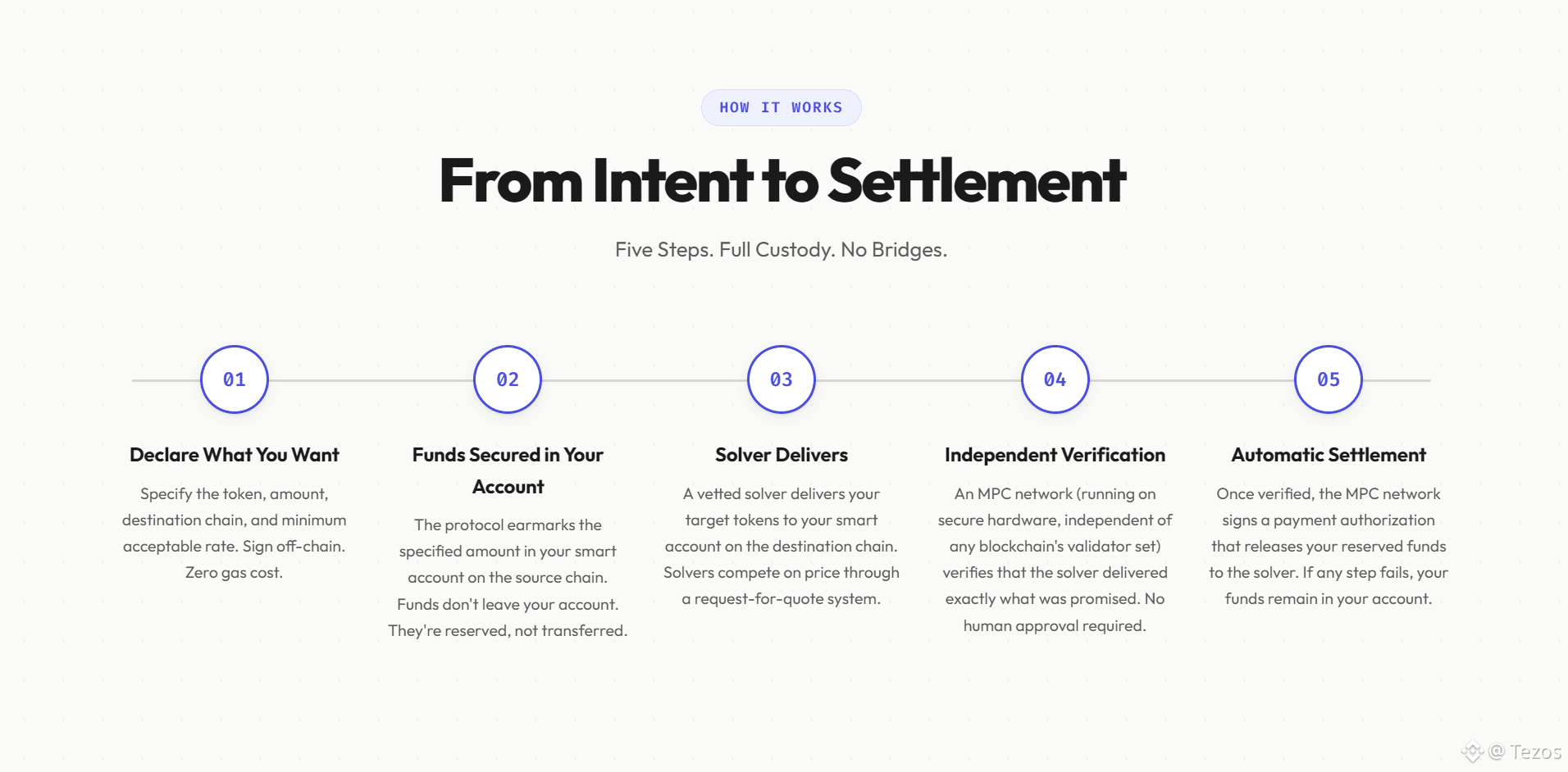 Under the hood, an MPC network verifies that the solver has delivered the expected result before any settlement is finalized. That removes the need for manual trust while keeping the process transparent and enforceable onchain.