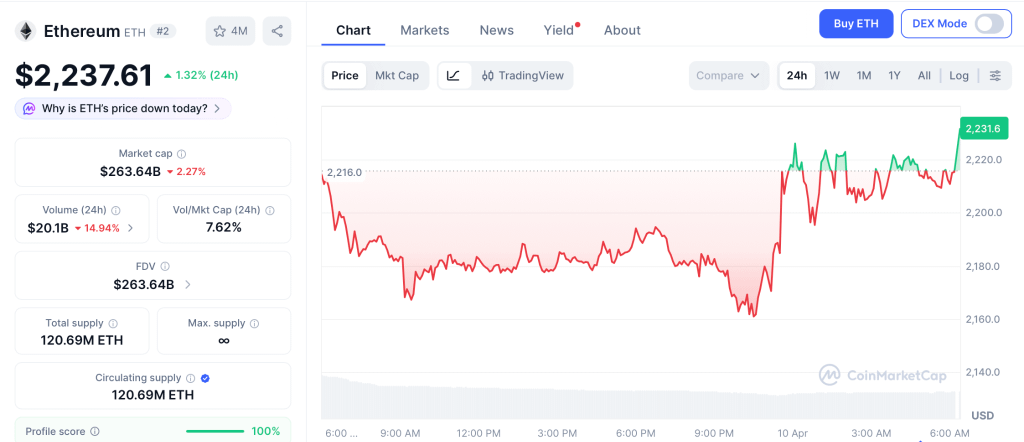 ETH negocia perto de $2,237 de acordo com o CoinMarketCap após ganhar 6.3% na recuperação do cessar-fogo. A Fundação Ethereum bloqueou 45,000 ETH em um dia, reduzindo a pressão de venda.