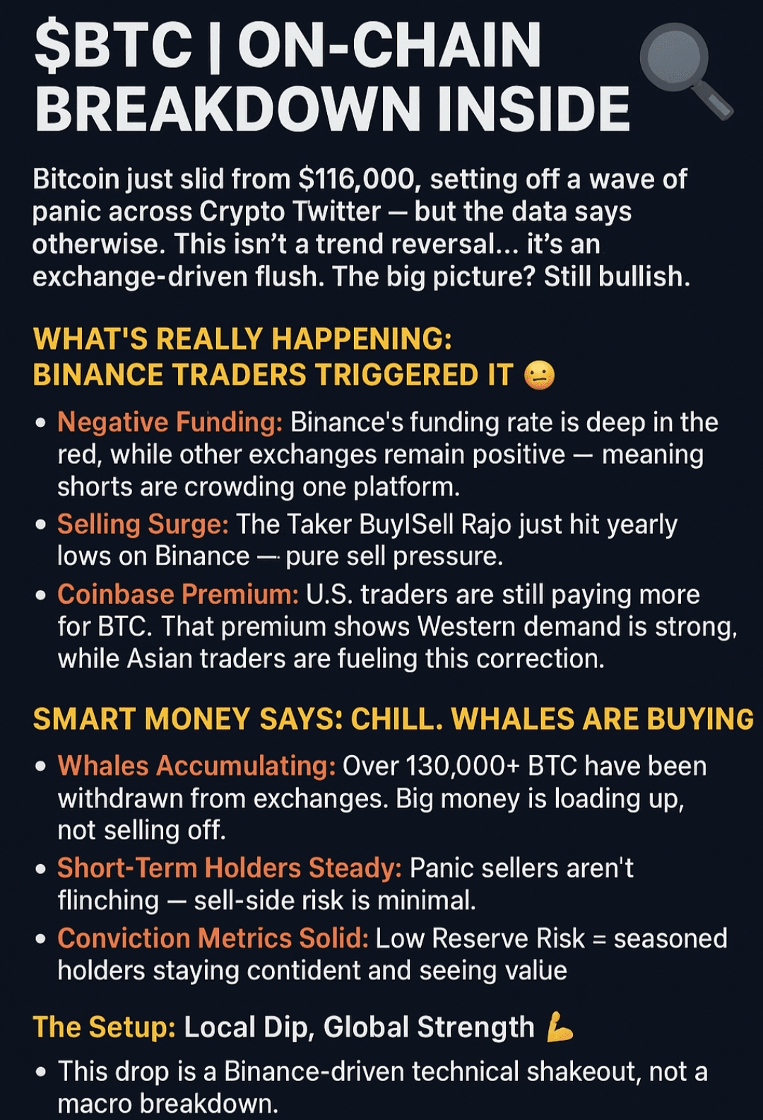 O Bitcoin acabou de cair de $116.000, desencadeando uma onda de pânico no Crypto Twitter — mas os dados dizem o contrário. Isso não é uma reversão de tendência… é uma liquidação impulsionada por exchanges. A grande imagem? Ainda otimista.