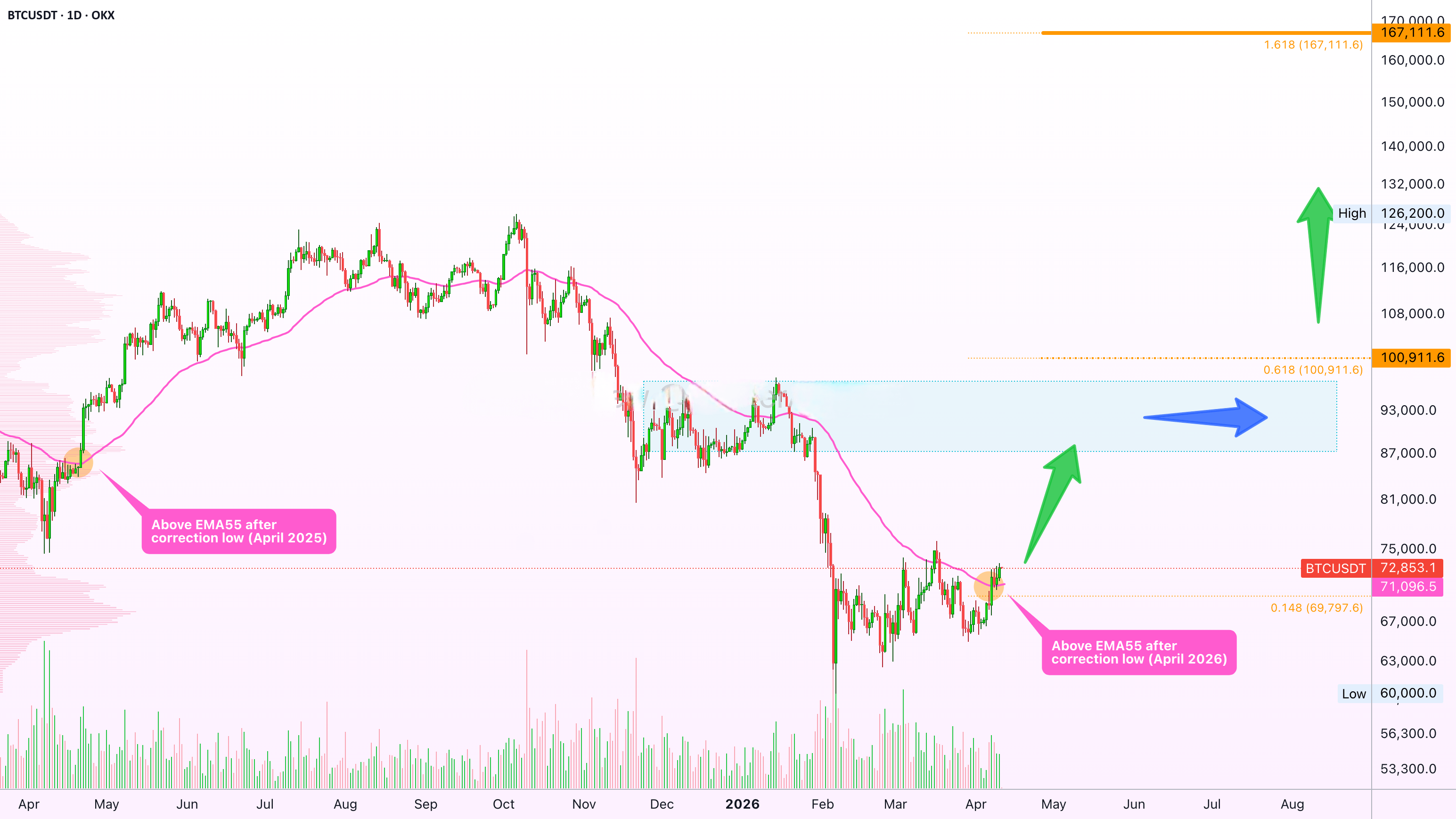 » BTCUSDT acabou de se mover diariamente acima da EMA55 após uma grande correção baixa acompanhada do maior volume em toda uma geração.